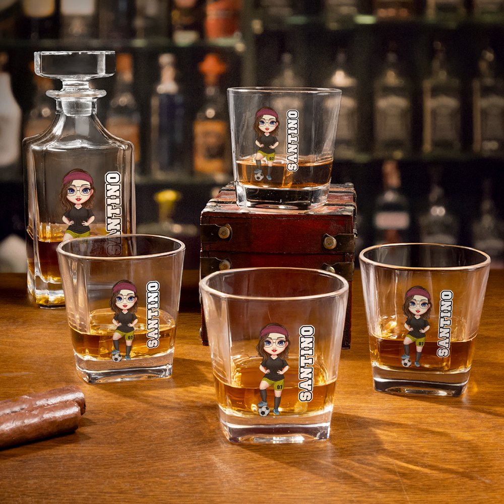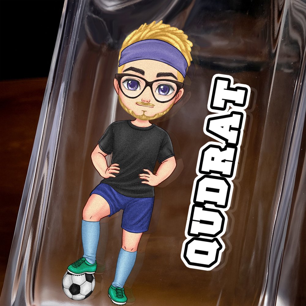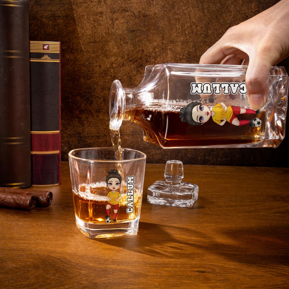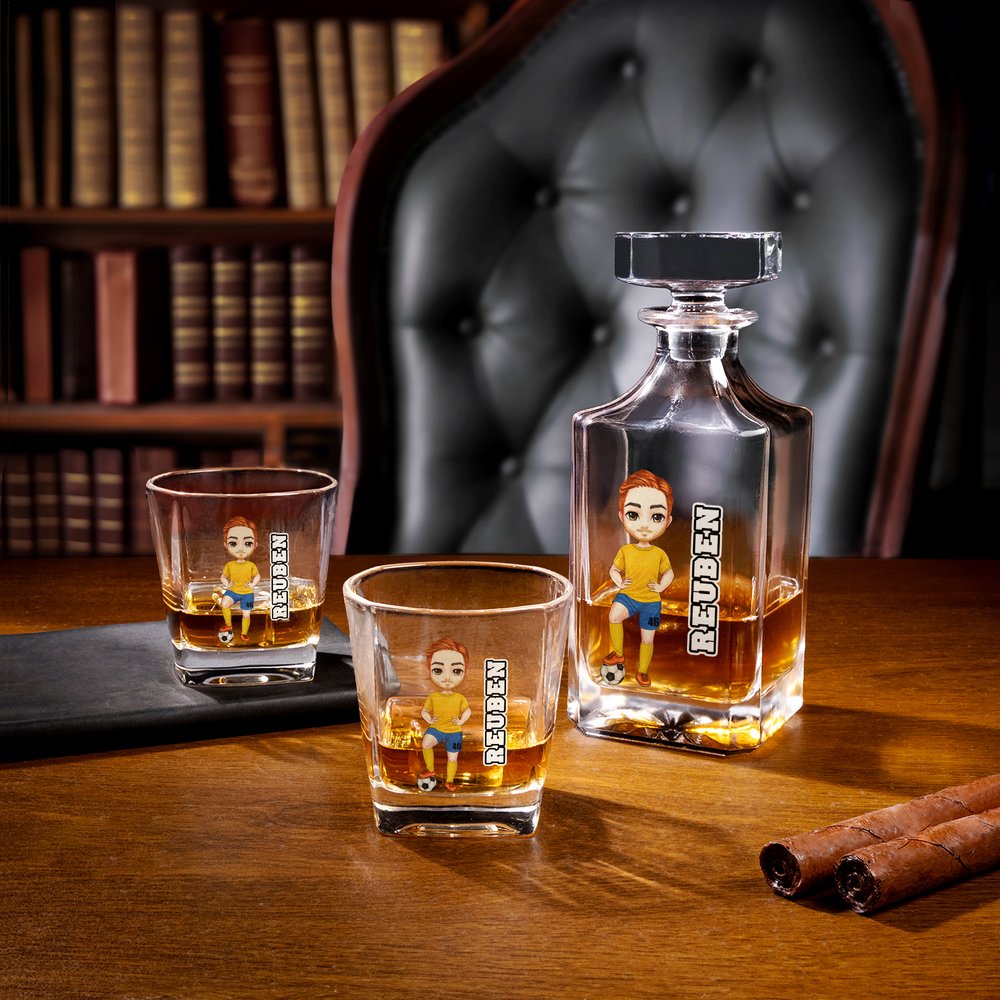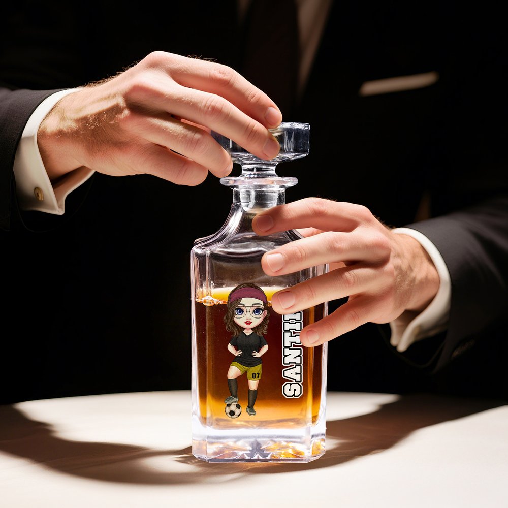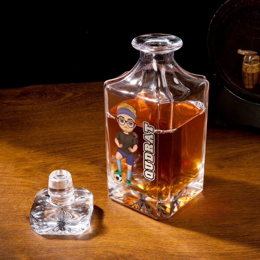 Craft a one-of-a-kind square whisky decanter by customizing a full soccer cartoon character and a custom name. The printing technique brings every personalized detail to life on the decanter’s front surface, turning a functional bar piece into a unique symbol of your love for soccer and premium spirits.
