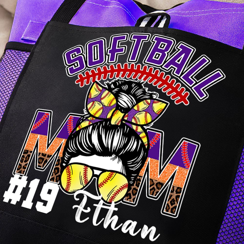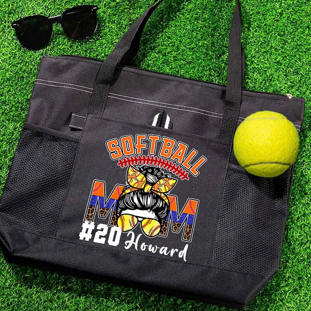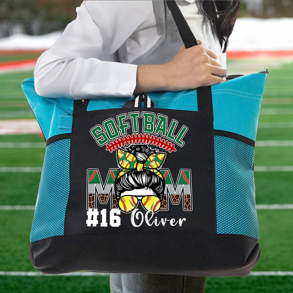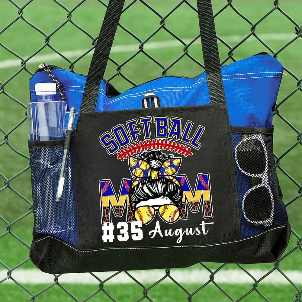 Designed for softball fans and sports-loving women, this stylish tote combines softball elements with customization for a chic yet sporty bag. The words "SOFTBALL MOM" stand out, and softball and animal print elements are incorporated into the letters "MOM", adding fun and vitality. Available in various colours, you can easily find a design that suits your style and personality, making it the perfect accessory for any active lifestyle.