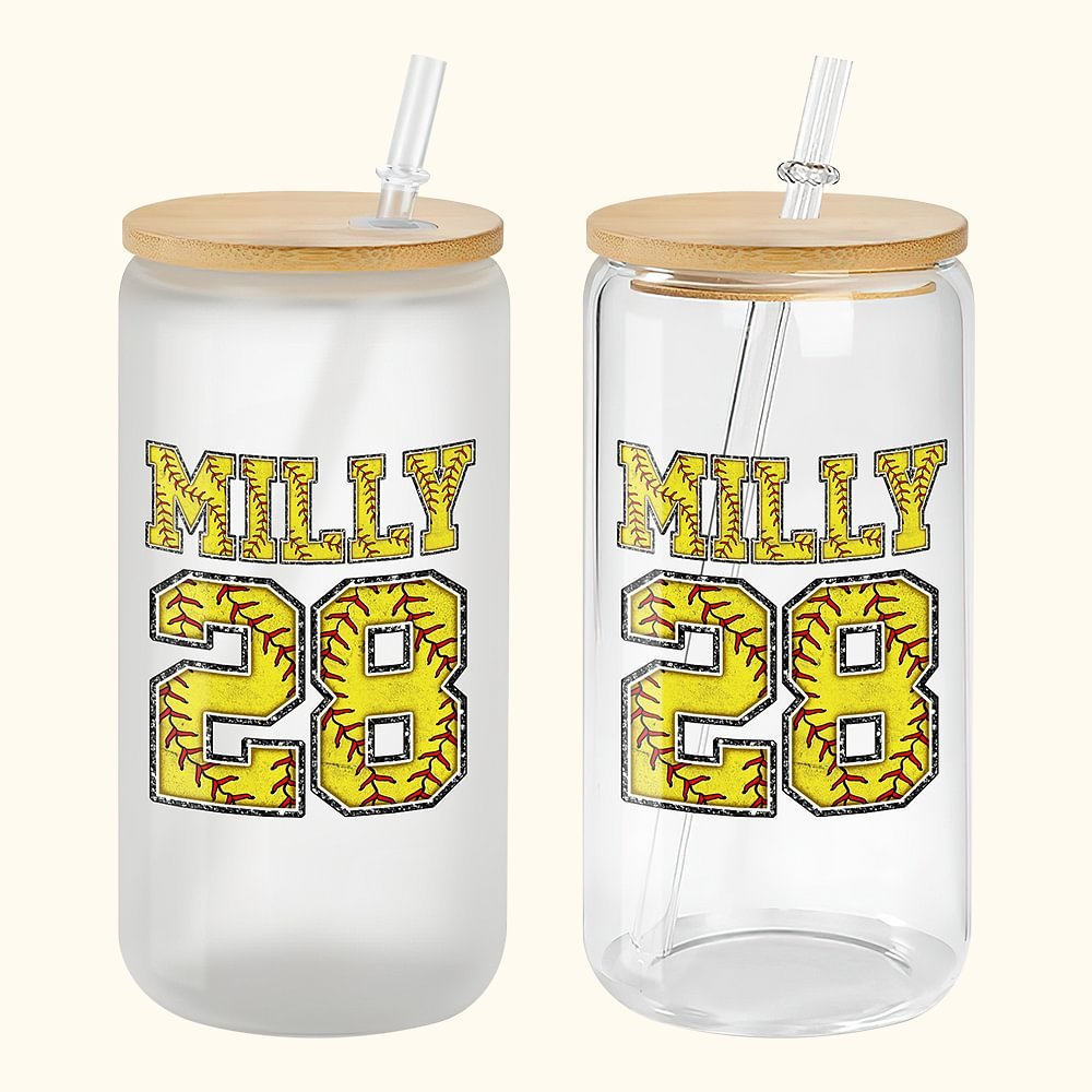 The glass tumbler feature a unique softball-inspired design, with the recipient's name and number creatively incorporated to mimic the look of an authentic jersey or uniform.