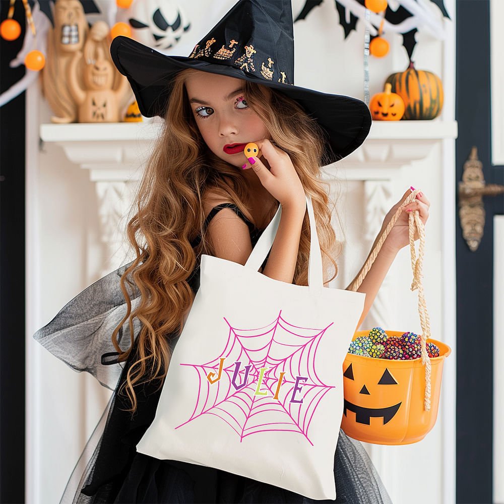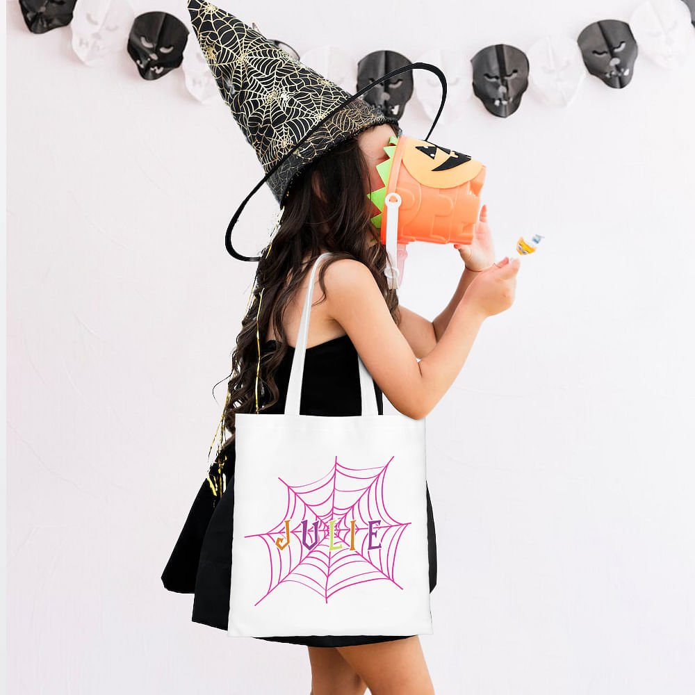 This tote bag is a thoughtful gift for children on Halloween. Children will be excited to take our spider web Personalized Halloween tote bag to play trick-or-treating games and spend a perfect Halloween happily.