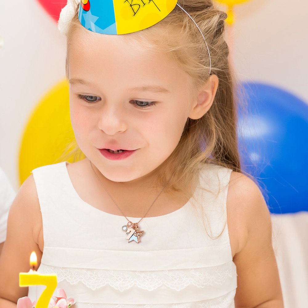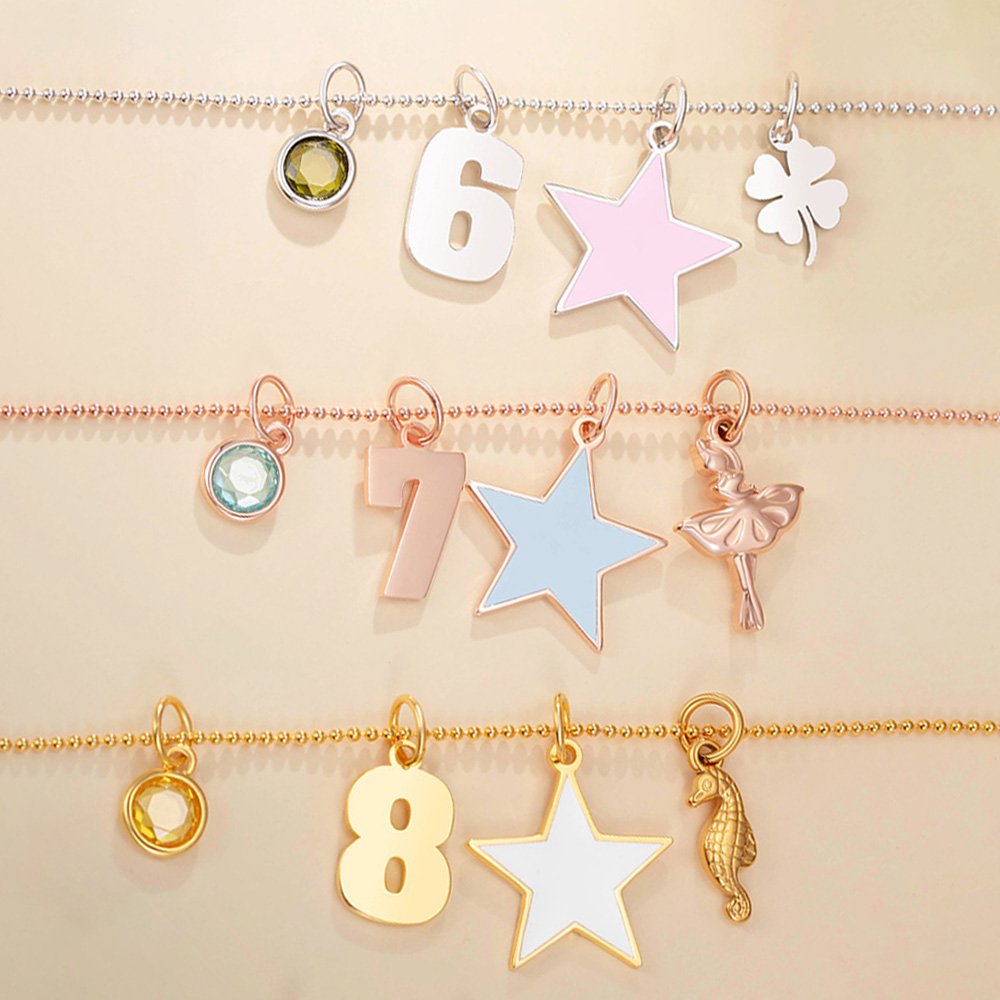 This exquisite necklace cleverly combines a variety of whimsical shapes, including birthstones, stars, fixed pendants with numbers, hearts, lightning, four-leaf clover, seahorses, and ballerinas. Each has a unique design and meaning, representing kindness, bravery, luck, friendship, and beauty. You can choose your child's age and birthstone and customize your child's name to make it a truly unique accessory.