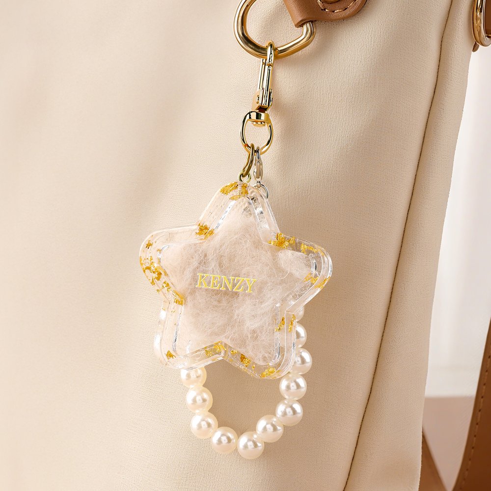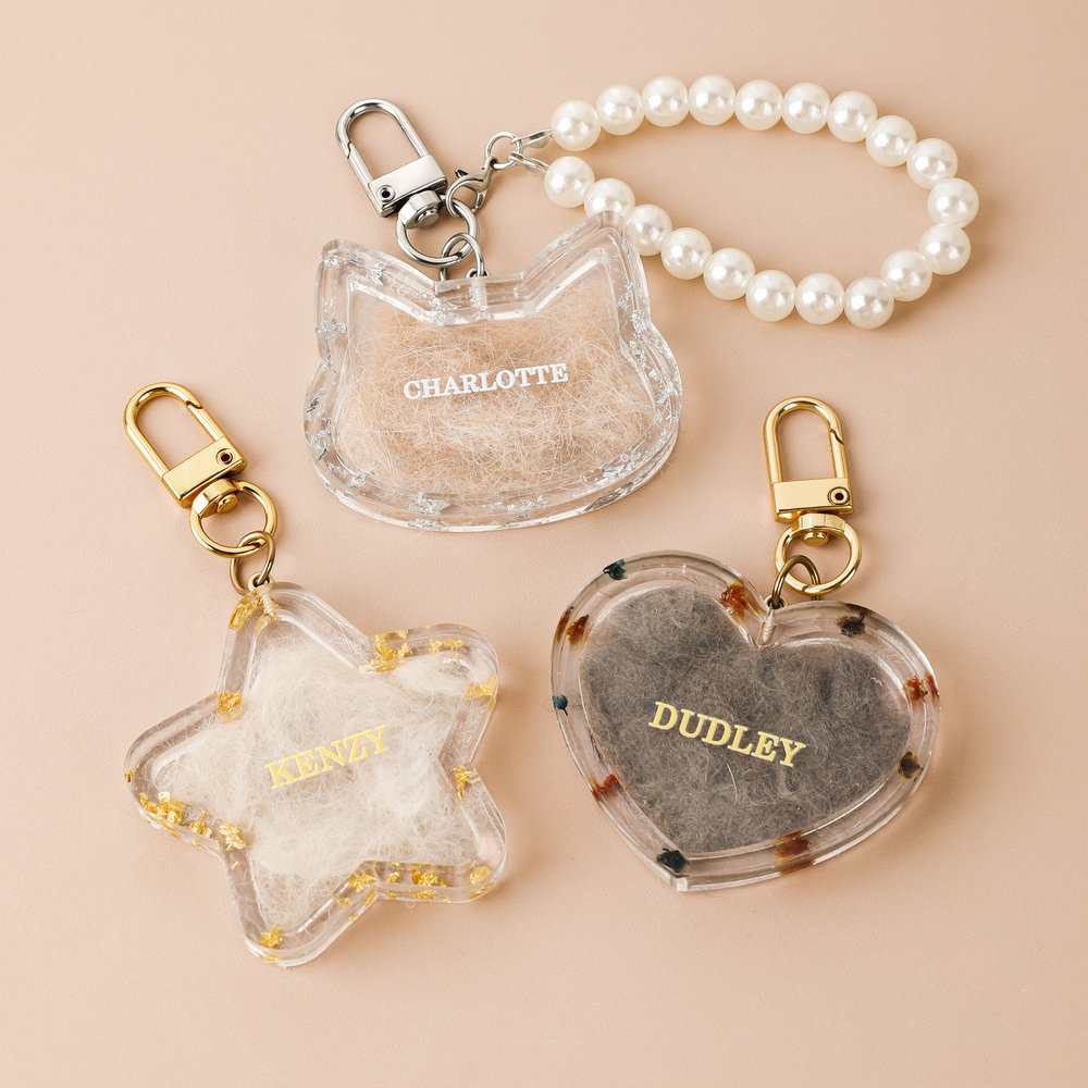 This eye-catching keychain features cat, star, and heart shape designs. It can be customized with your pet's name and comes with a pearl chain. You can also store your pet's hair inside, transforming a simple keychain into a unique, personalized keepsake.