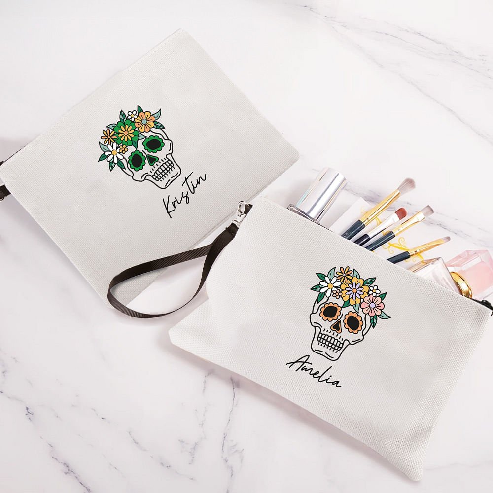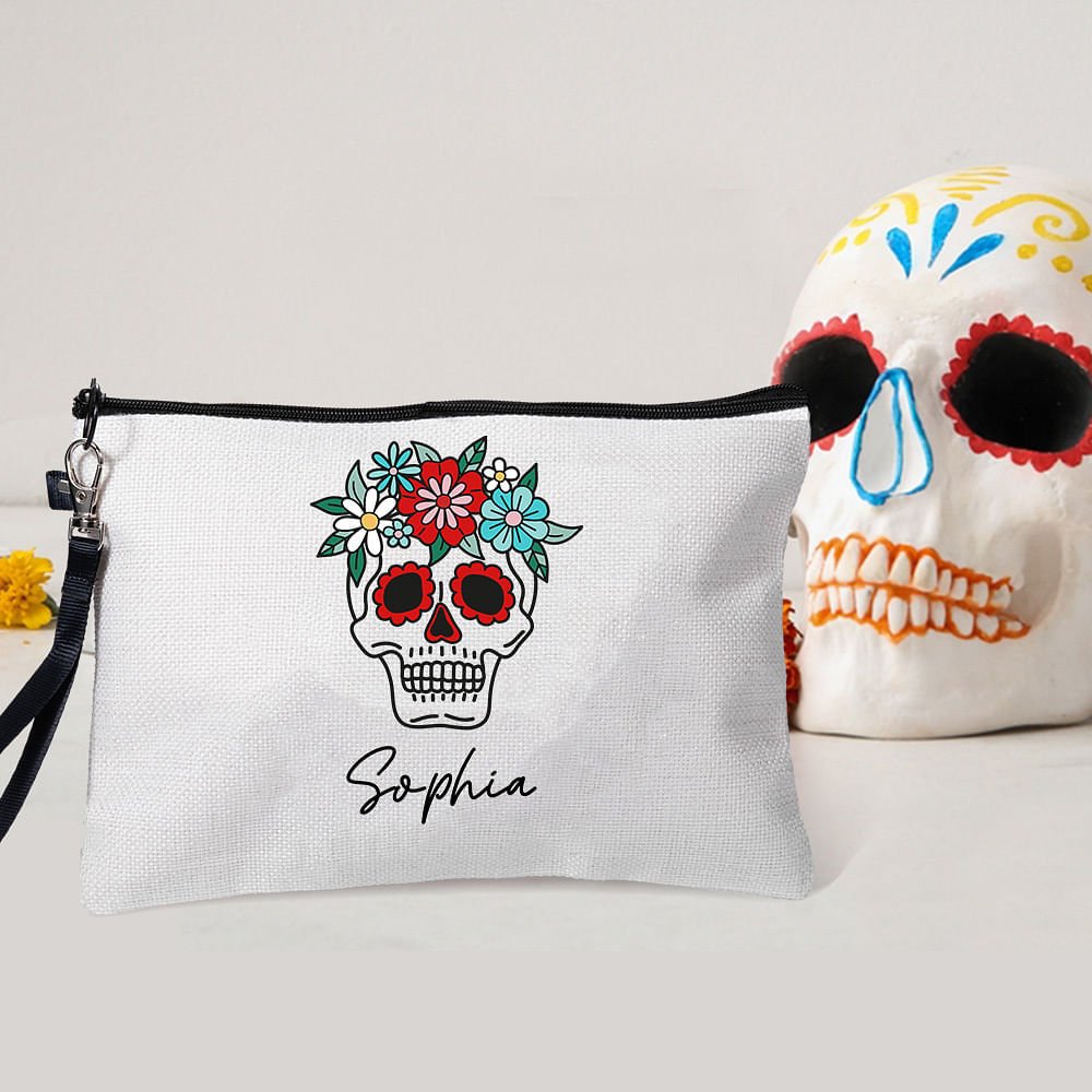 This Personalized makeup bag is inspired by the unique element of the Day of the Dead - the sugar skull - showing a strong festive atmosphere. You customize a name to make the bag full of personality and heart.