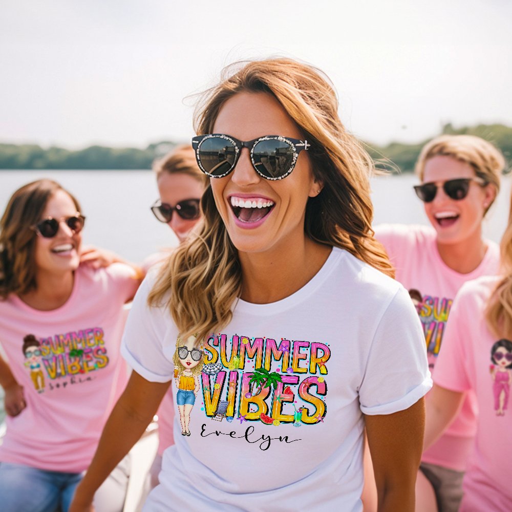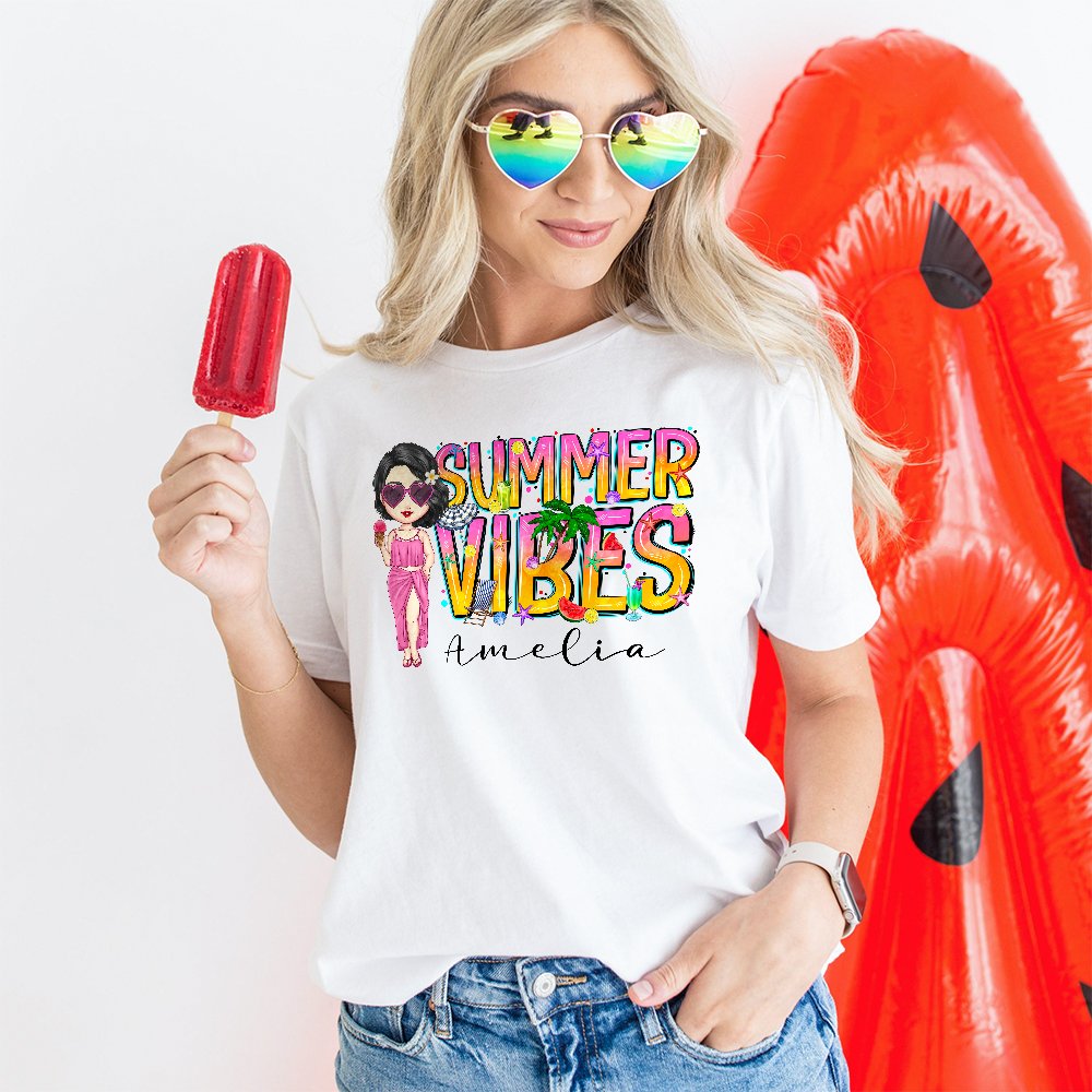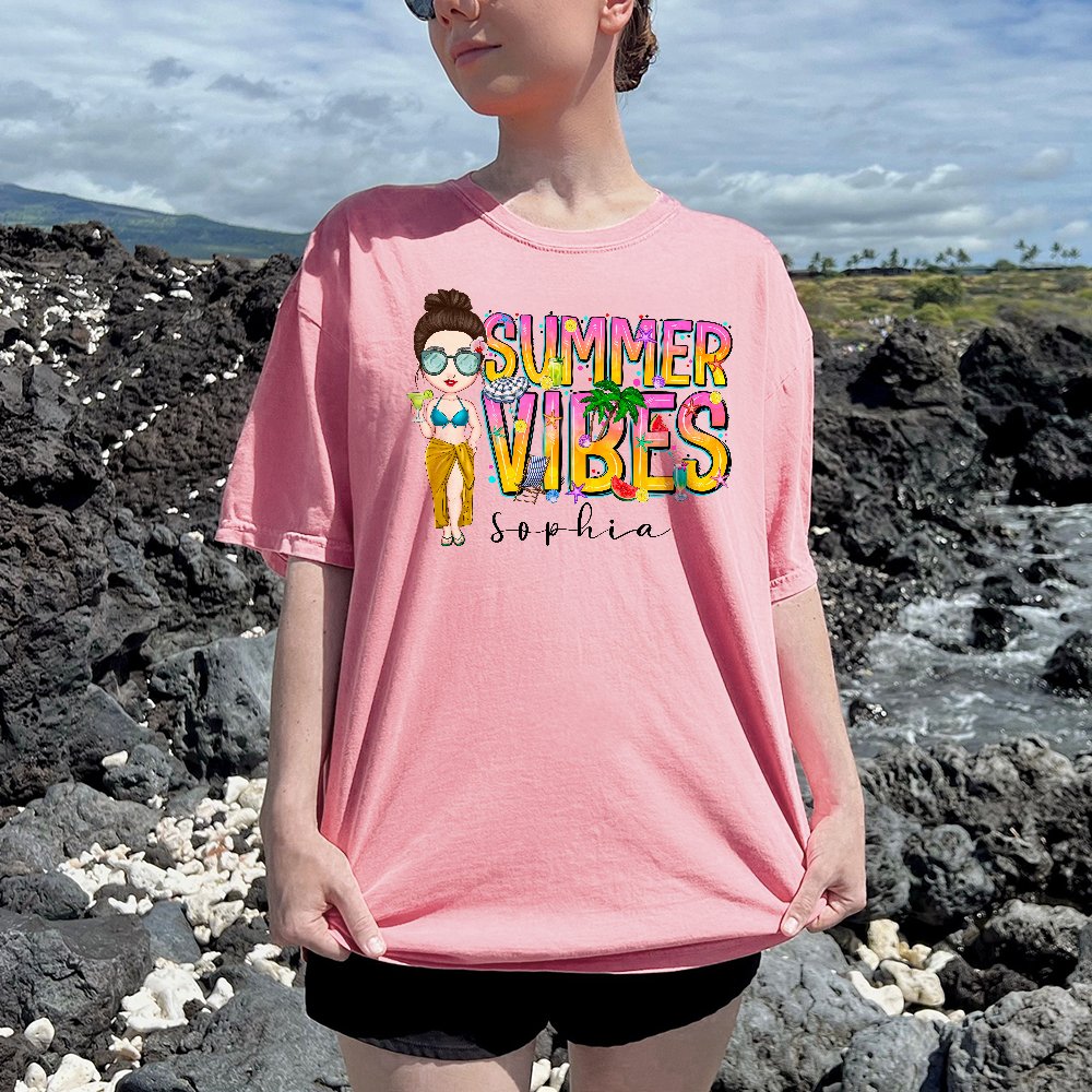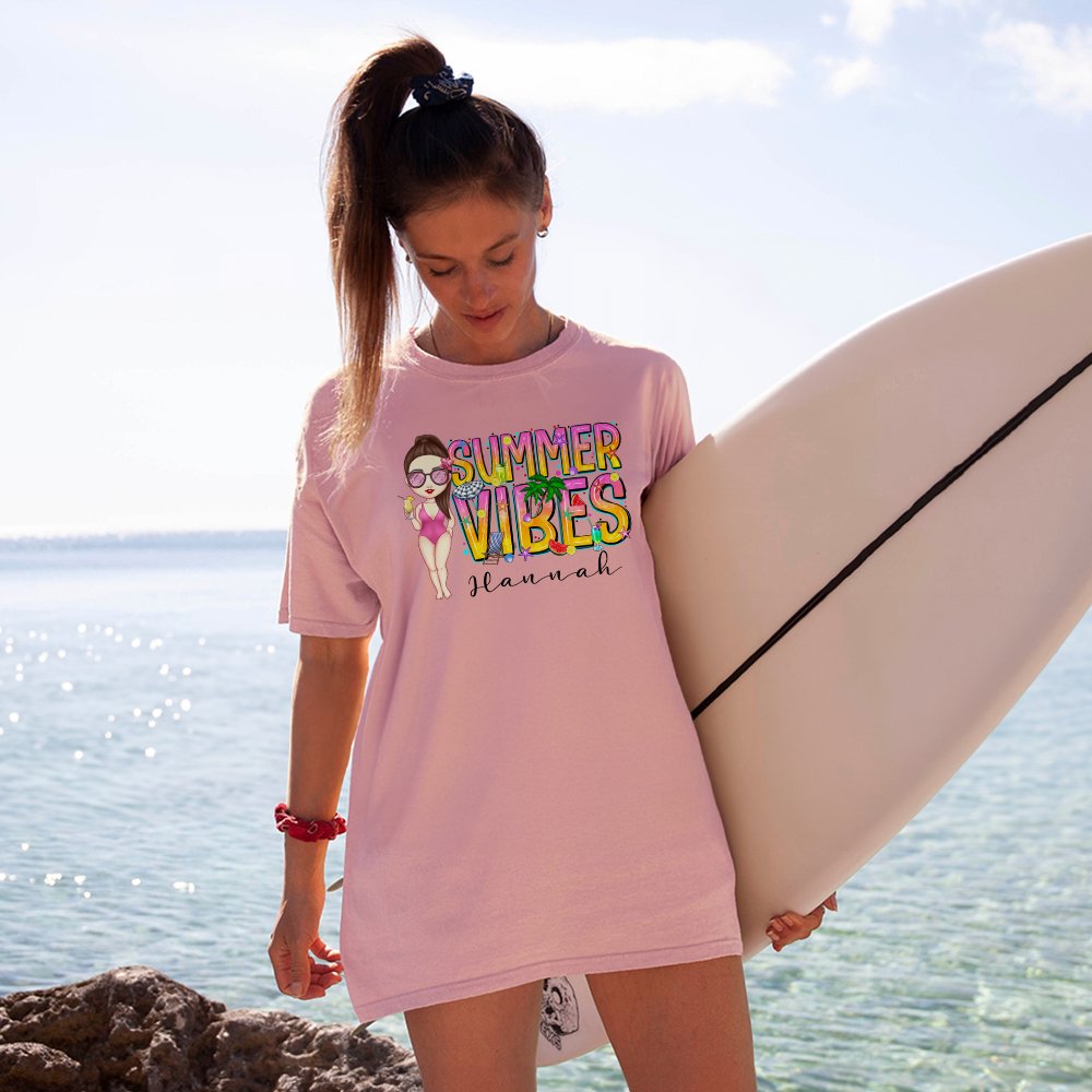 The front of our T-shirts uses a "SUMMER VIBES" slogan design, colourful gradient font colours, and beach elements such as juice and coconut trees to create a cool and casual atmosphere. You can customize the cartoon image and add your name to show your unique summer style and welcome the arrival of summer.