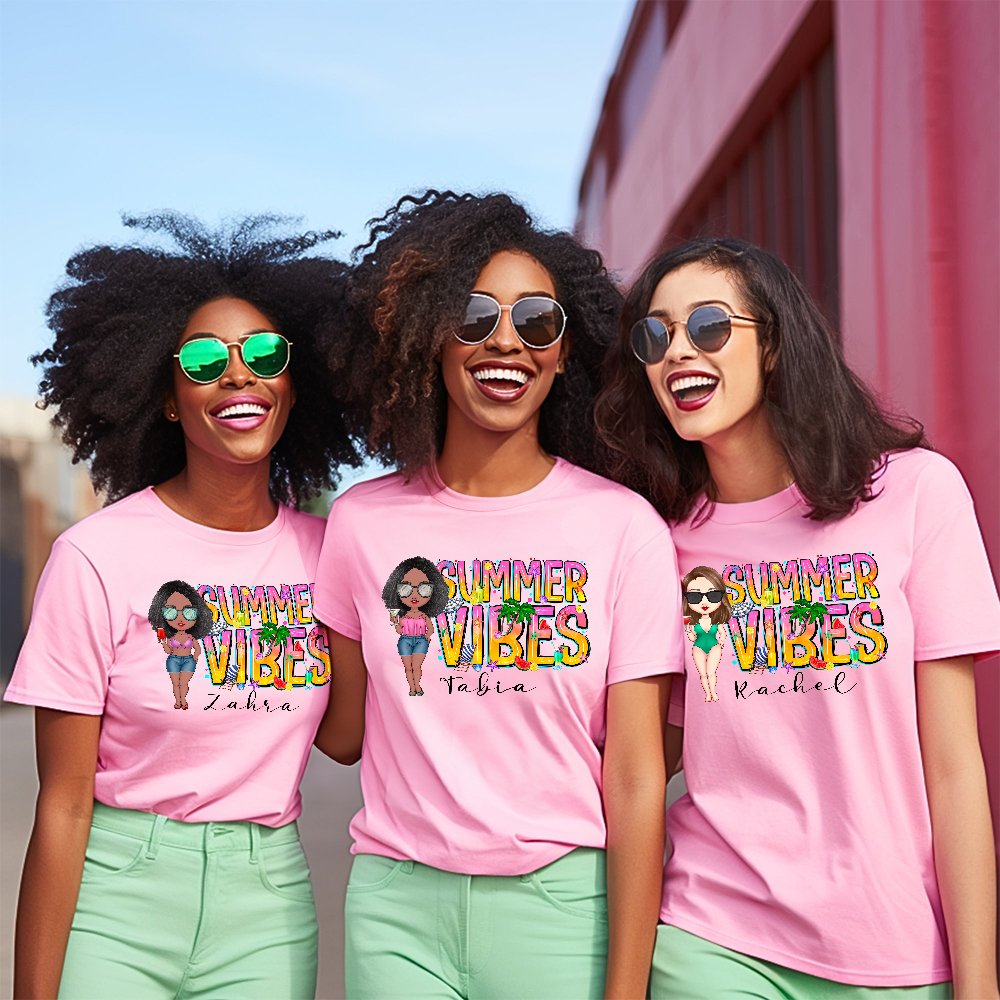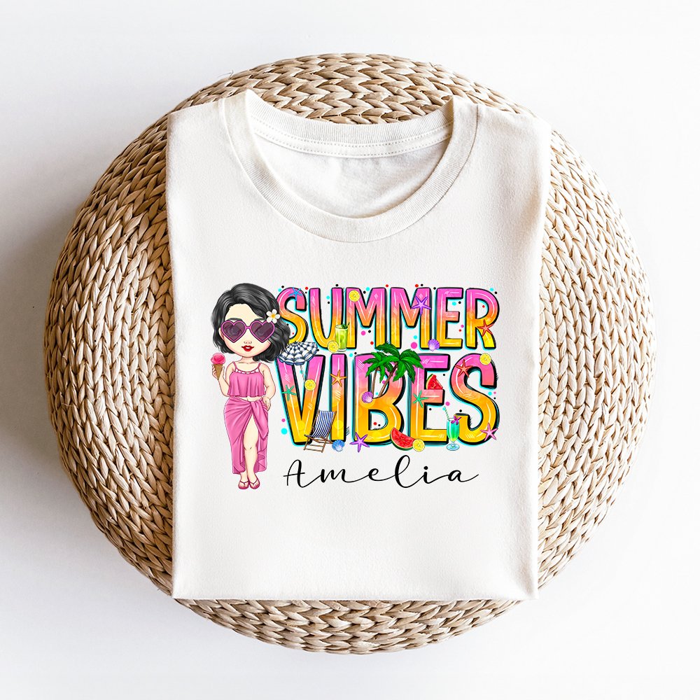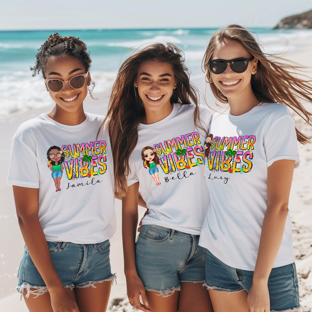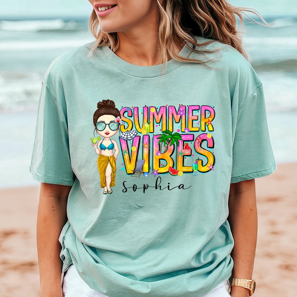 The front of our T-shirts uses a "SUMMER VIBES" slogan design, colourful gradient font colours, and beach elements such as juice and coconut trees to create a cool and casual atmosphere. You can customize the cartoon image and add your name to show your unique summer style and welcome the arrival of summer.
