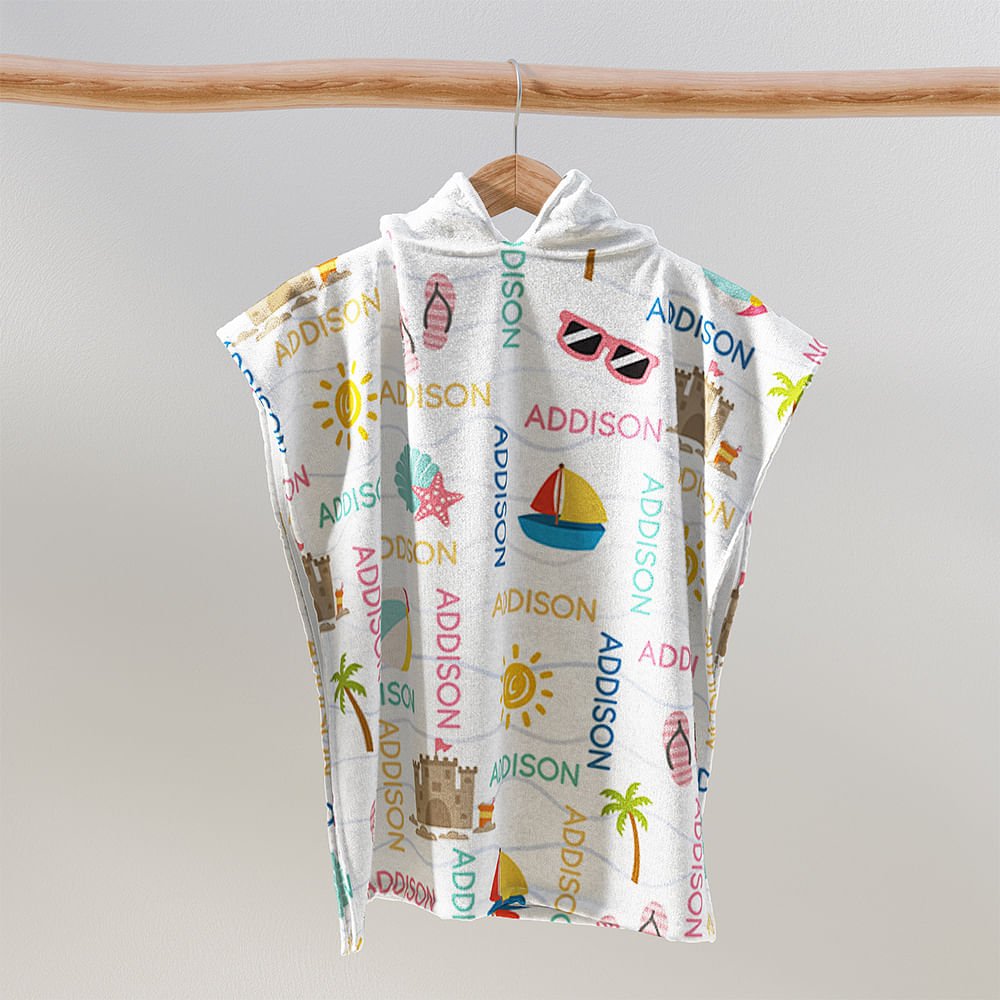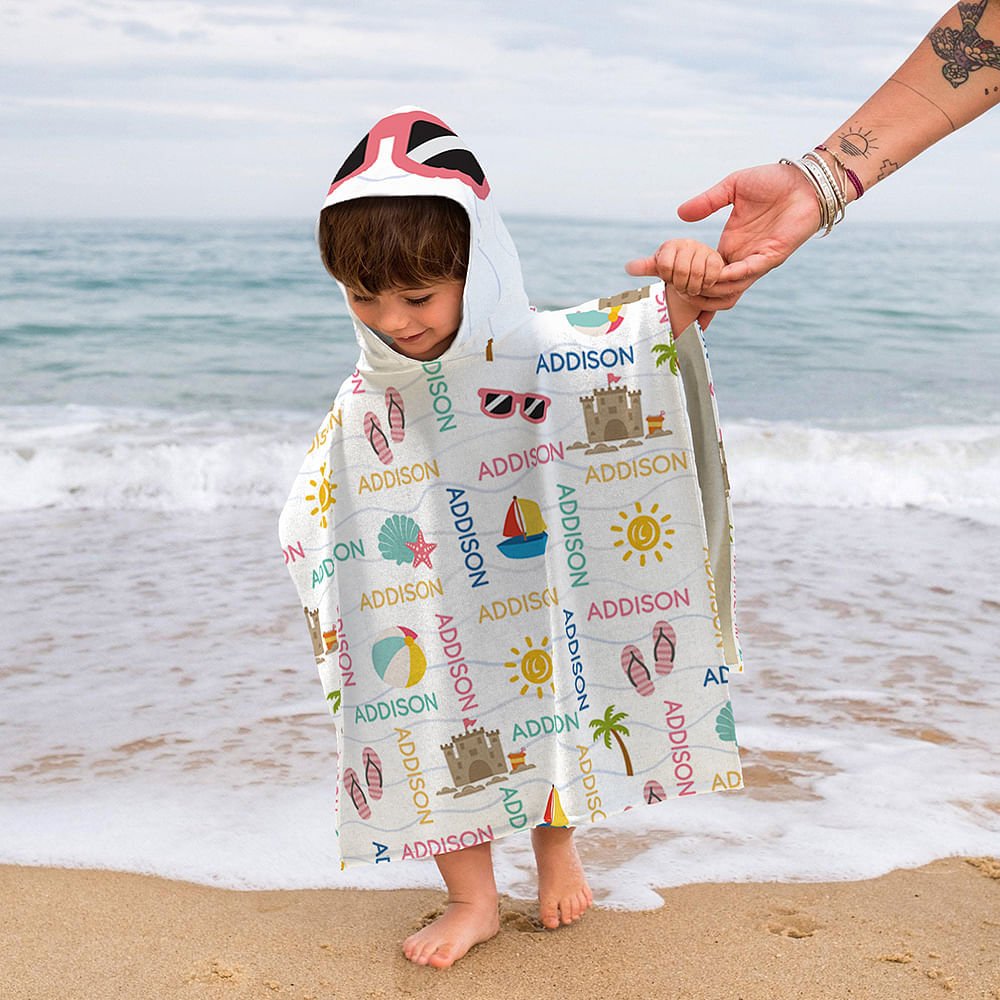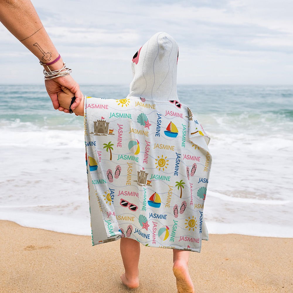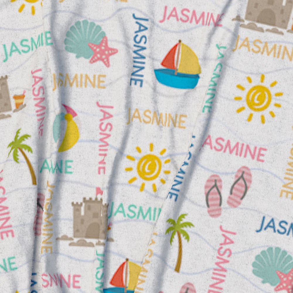 The unique combination of elements such as the sun, shells, castles, sunglasses, sailboats, etc., adds childishness to the seaside and makes the holiday mood more relaxed and pleasant. Personalise the name to create a one-of-a-kind beach towel, showing a unique style, and making it a truly unique souvenir.