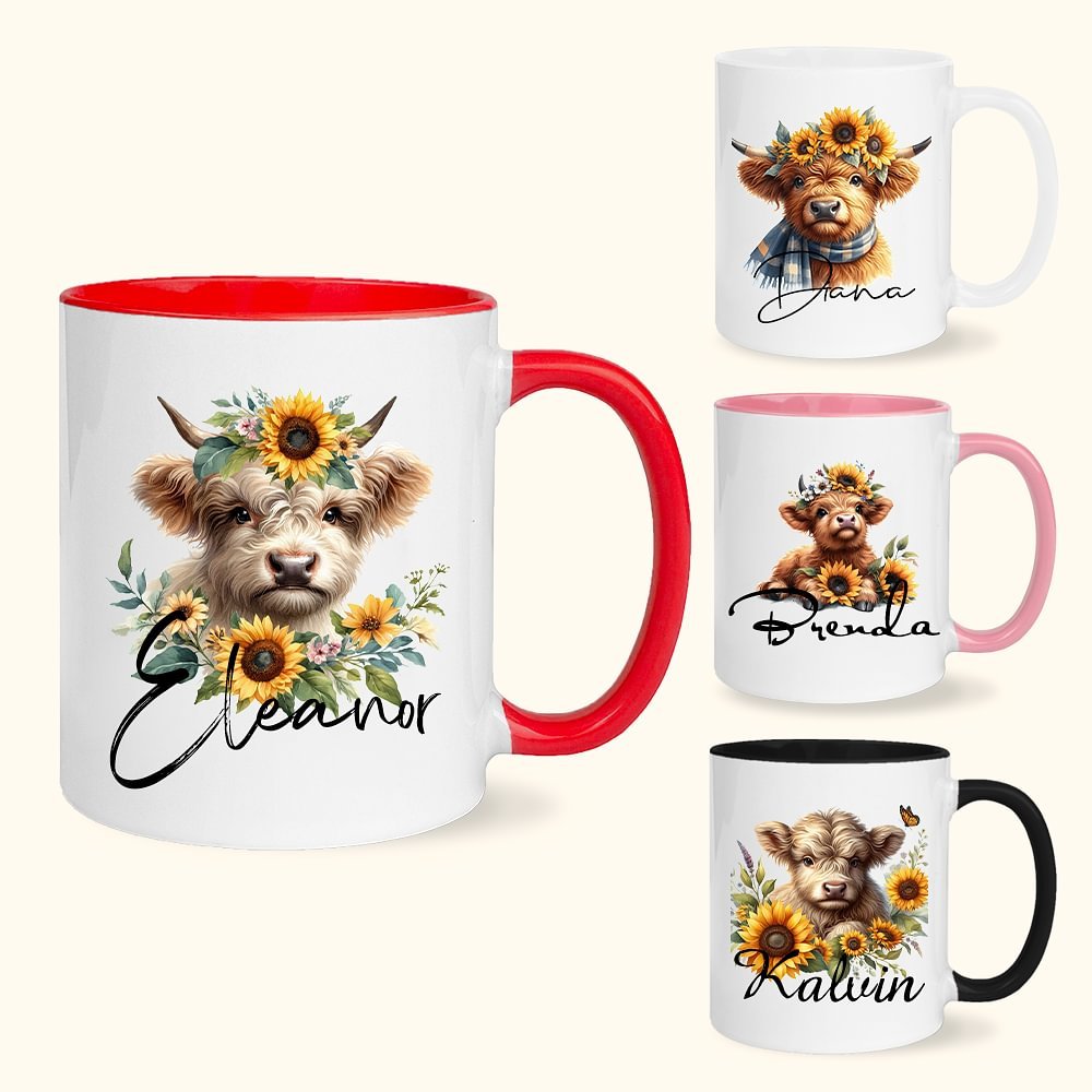 This beautifully crafted mug combines a highland cow with sunflowers to create a charming calf-like design that adds a touch of fun to your morning coffee or tea. But that's not all - the mug's interior comes in seven colors, and you can even have your name printed on the front, making it a one-of-a-kind mug.