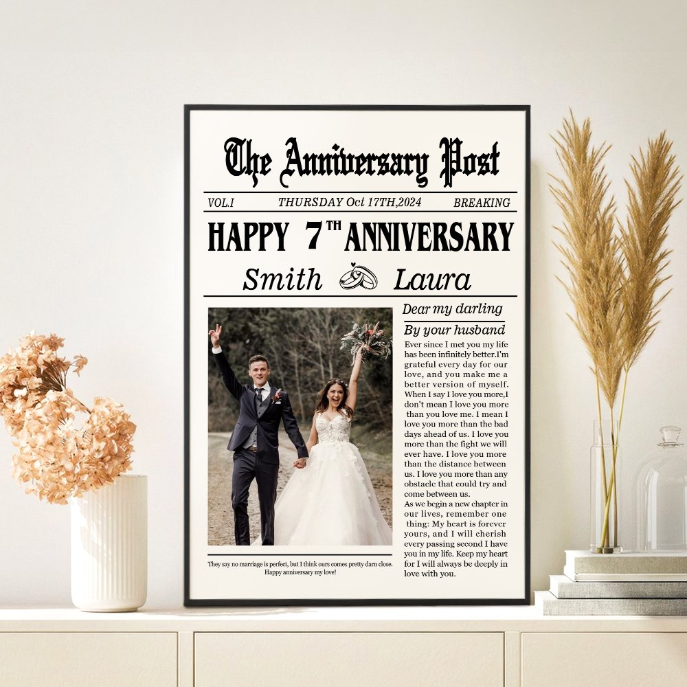 This beautiful canvas painting commemorates the special moments in a marriage. Featuring a vintage newspaper-style layout, it can be fully customized with the couple's names and the date of their anniversary or a significant day in their relationship, making it a unique tribute to your love story.