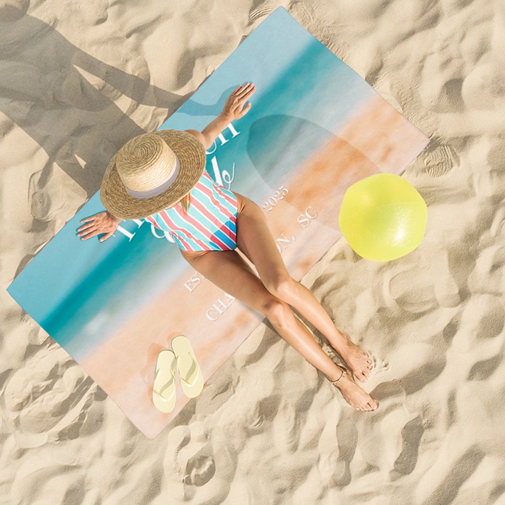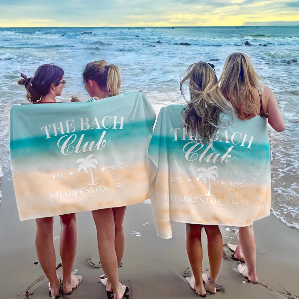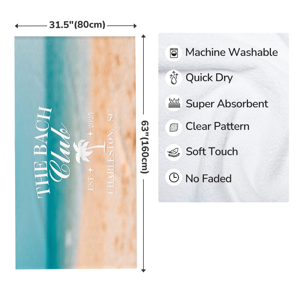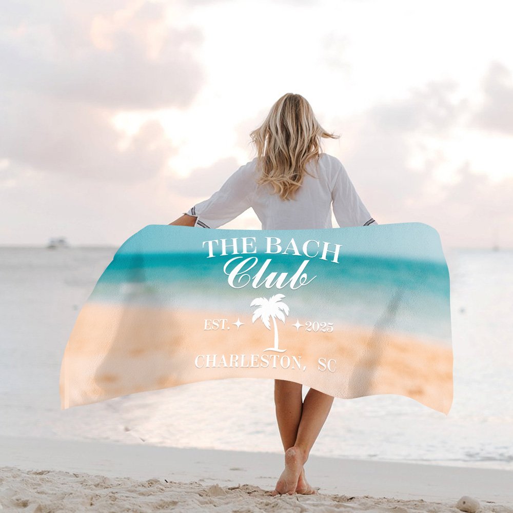 Boasting a striking slogan, "The Bach Club," our beach towel offers customization options such as the year and coastal location, perfectly blending the spirit of your coastal celebration with elegance and fun.