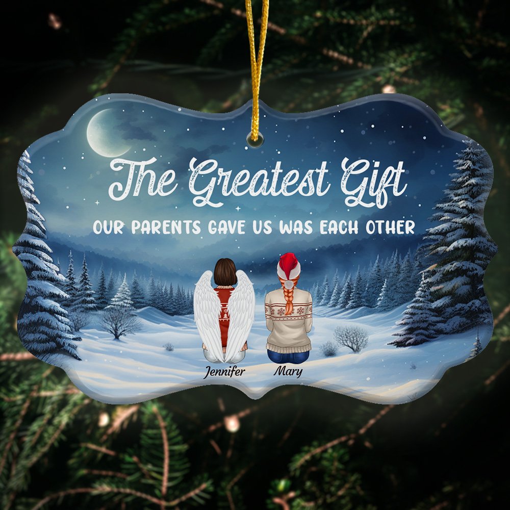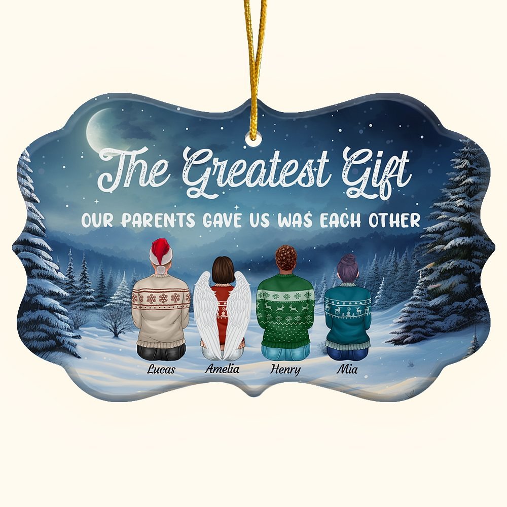 The message "The Greatest Gift Our Parents Gave Us Was Each Other" is beautifully printed on the ornament, conveying deep emotions between loved ones through simple trinkets.