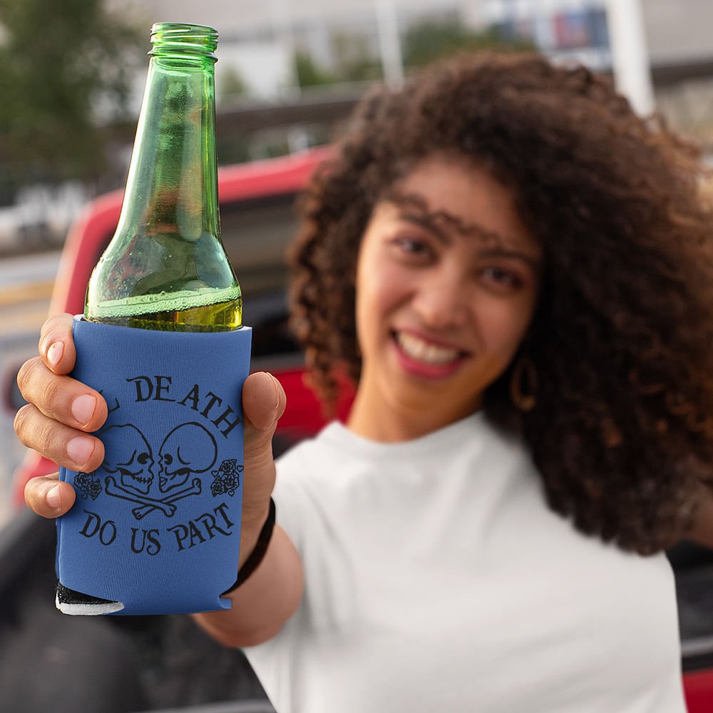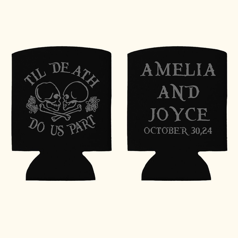 These beer can coolers feature a stunning sugar skull design with the quote "Til Death Do Us Part" in classic Day of the Dead colours. They are a perfect way to commemorate your special day. But the real magic comes when you add your own personal touch—each cooler can be customized with the names of the happy couple and their special date, creating a truly unique and meaningful keepsake that will be cherished for years to come.