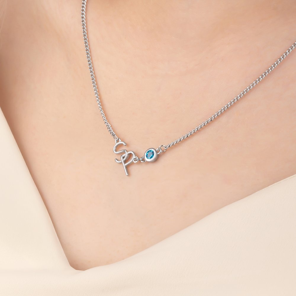 This exquisite piece of jewellery features a delicate letter pendant adorned with your chosen birthstone, making it a truly unique and meaningful gift. You can fill in 2-3 letters, which feature a tiny interlocking design.