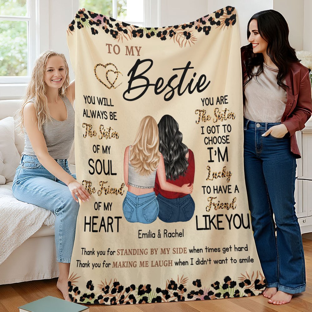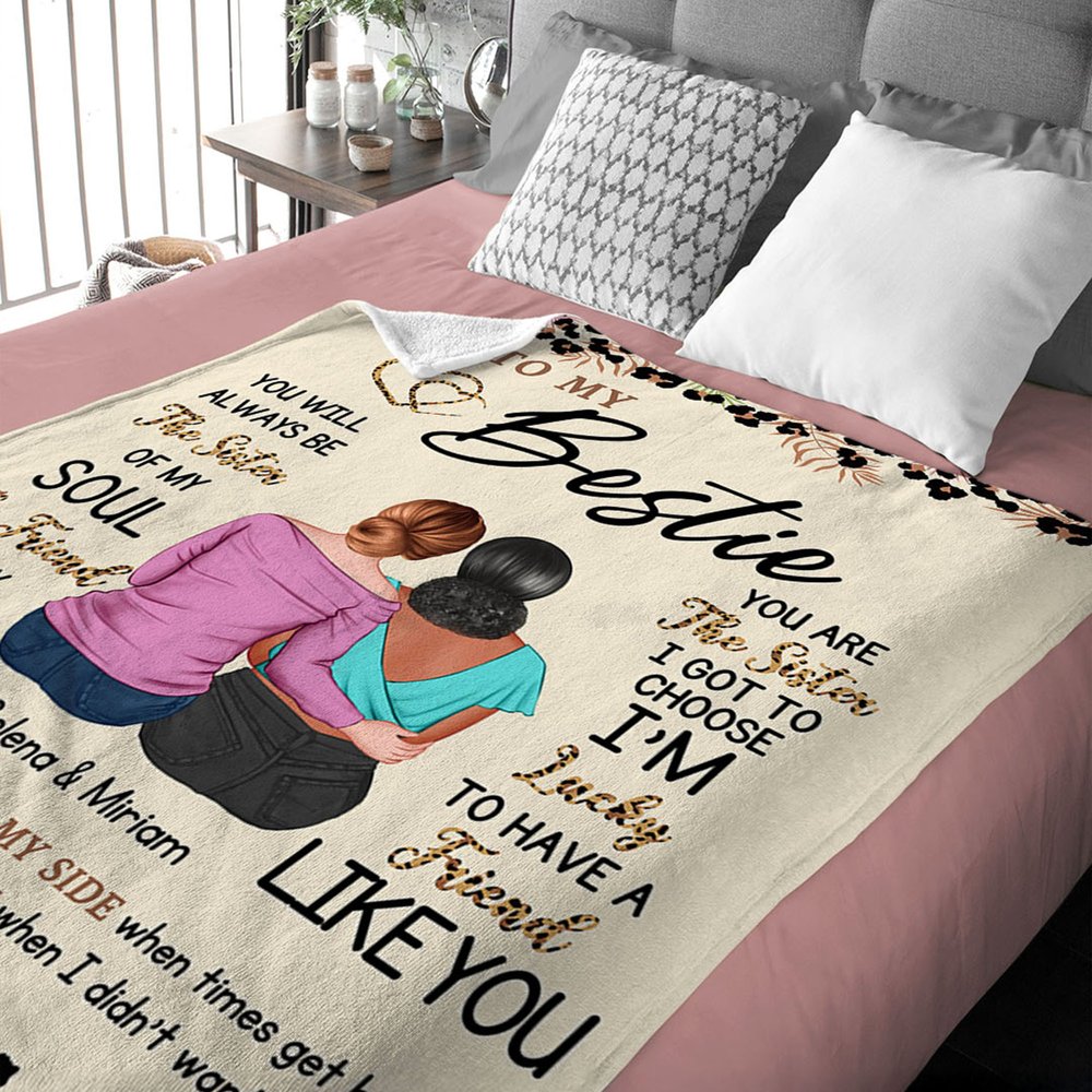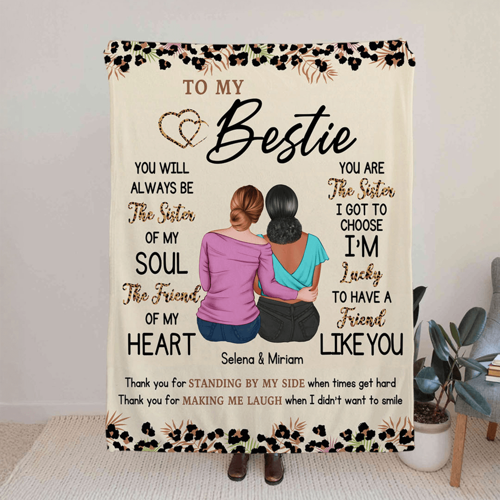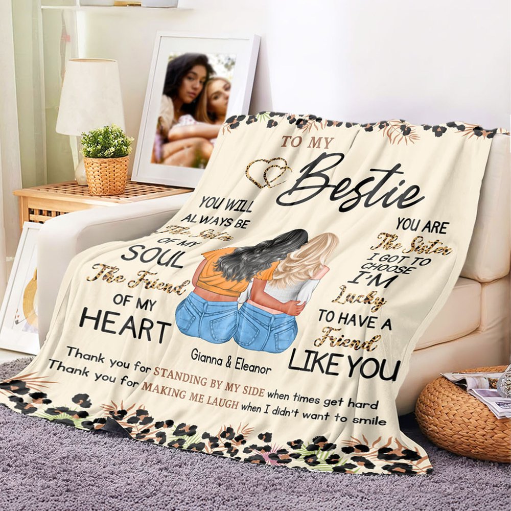 This blanket features a custom design—best friends illustration matching your vibe, heartfelt friendship quotes, e.g., “You are the sister I got to choose”, and your names, framed with a trendy leopard-print border. The warm, emotional messaging turns a cozy blanket into a personalized tribute to your unique bond.