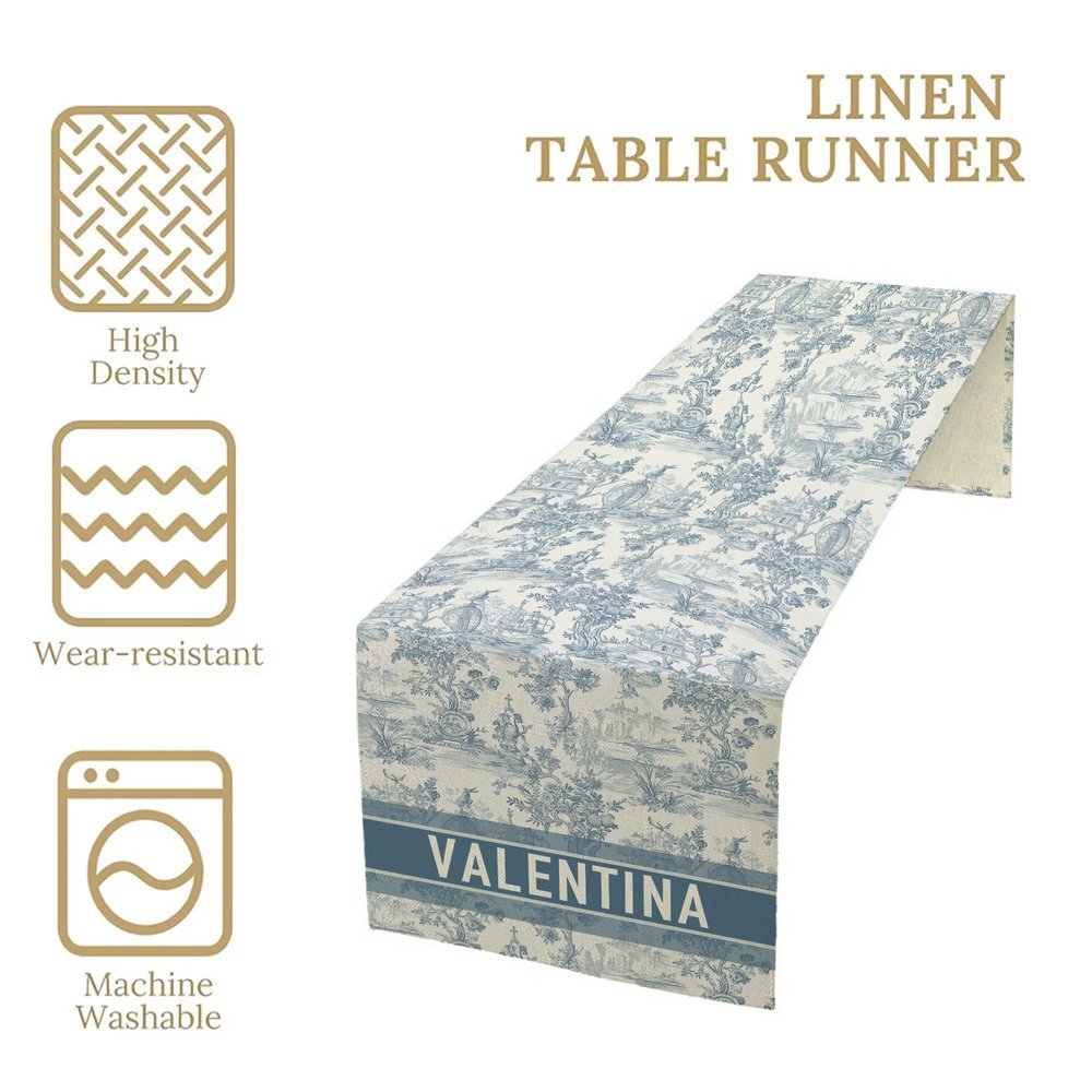 Crafted from high-quality polyester, the table runner is durable, wear-resistant, and machine washable. The heat transfer printing process ensures the Toile de Jouy pattern and custom text remain vibrant and fade-resistant, even after multiple washes. This combination of premium material and printing makes it a long-lasting choice for both daily use and special occasions, while maintaining its elegant appearance.