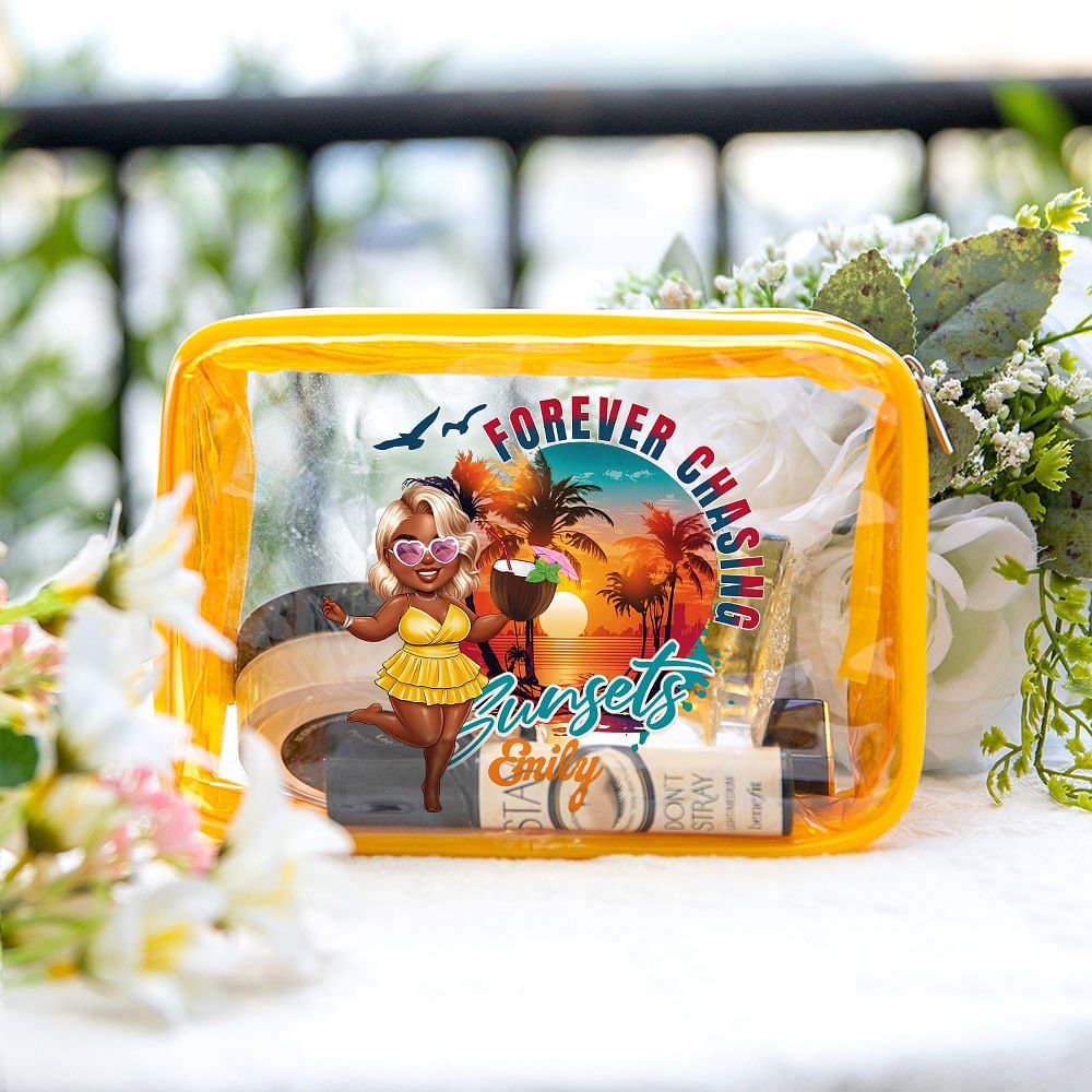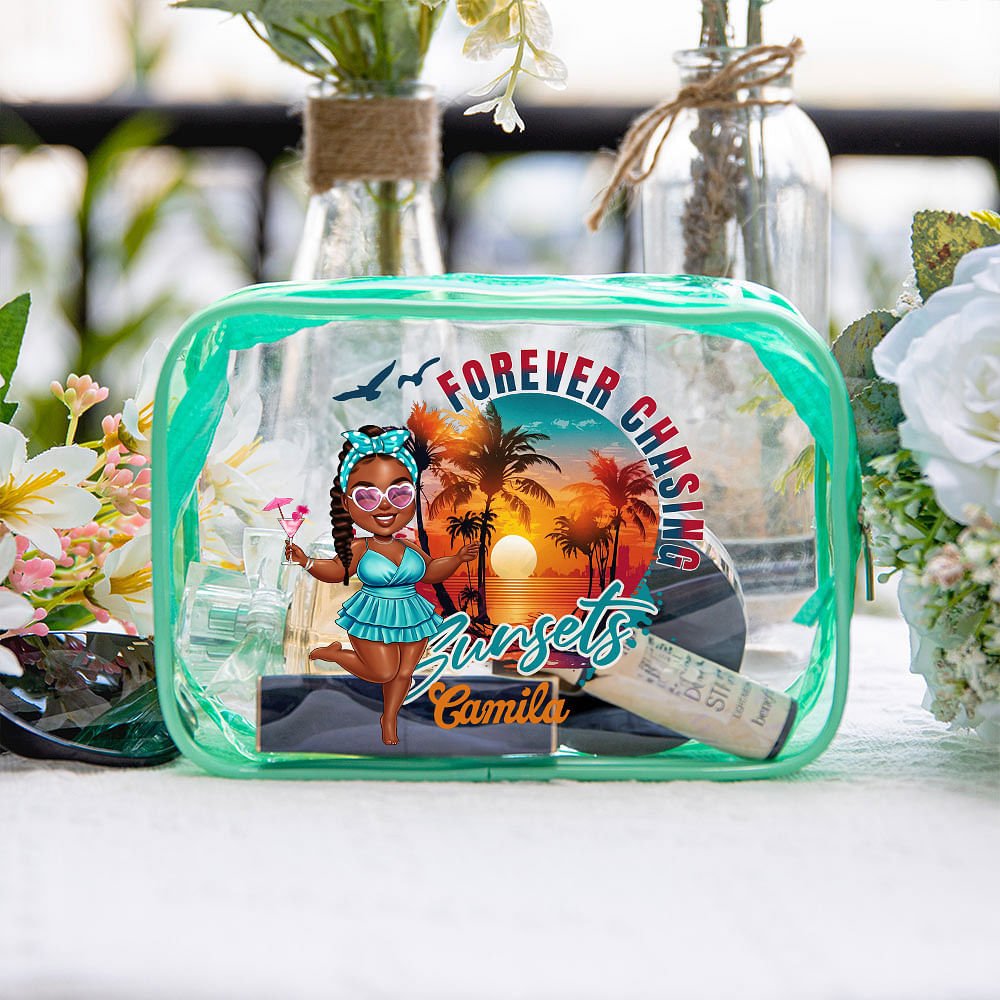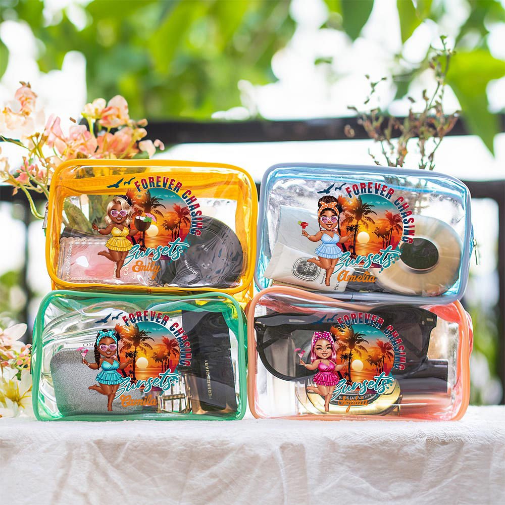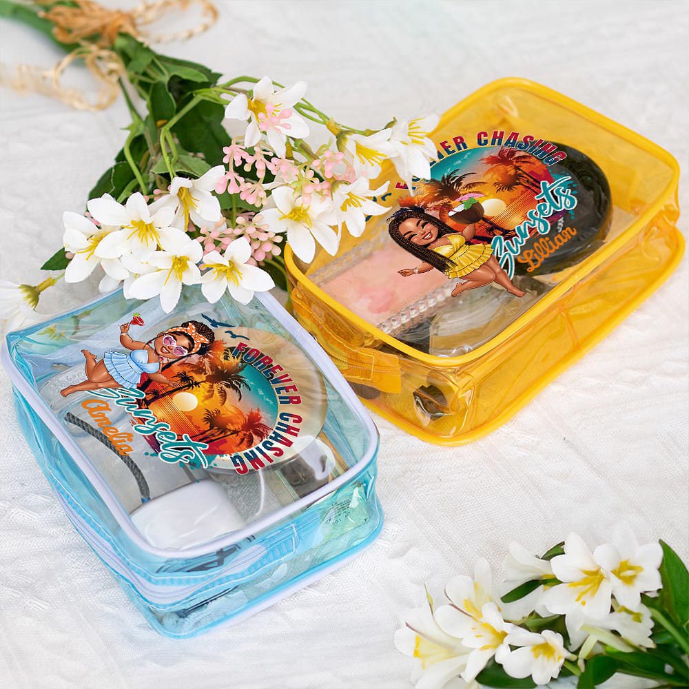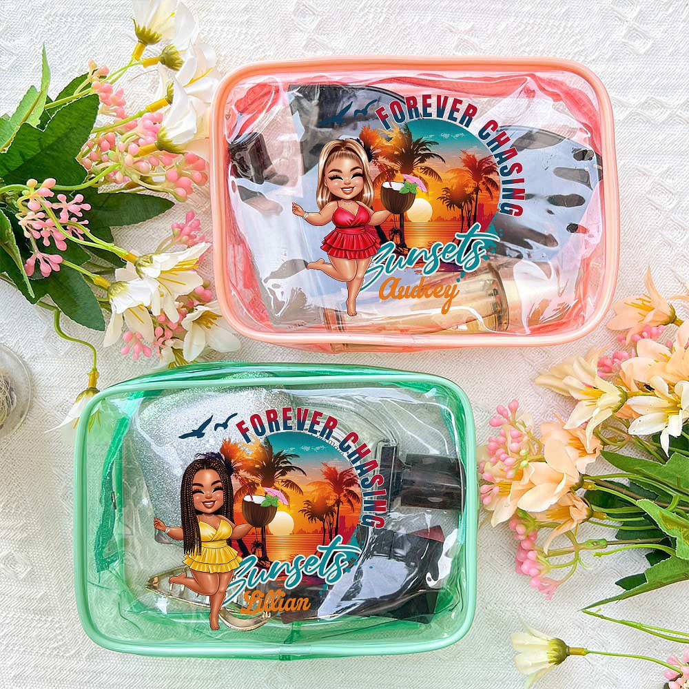 This Personalized clear makeup bag combines functionality with whimsical charm. Featuring adorable cartoon characters in a "forever chasing" design and customized with your name, it's both a practical storage solution and a fun fashion statement. The clear material allows for easy visibility of contents, saving time when searching for specific items. Its spacious interior makes it perfect for organizing makeup, skincare products, or travel essentials, making it an ideal companion for summer vacations or daily outings.