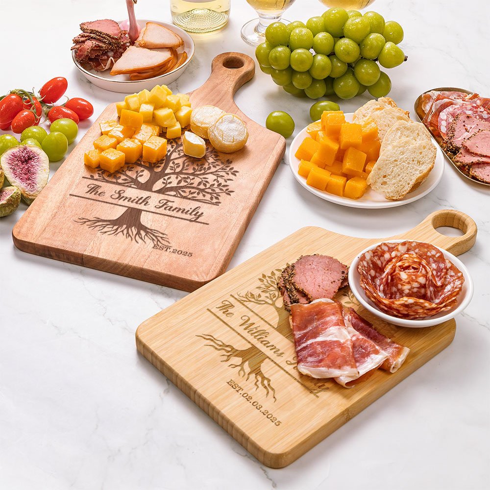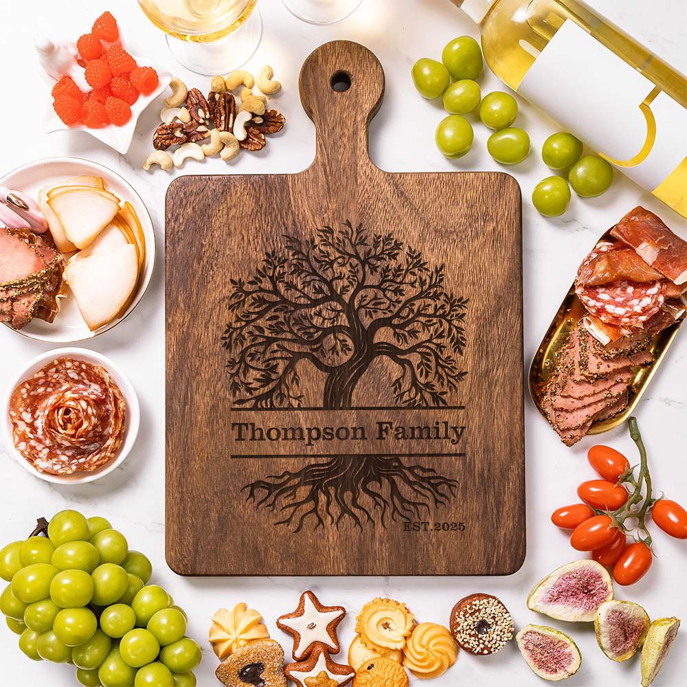 This cutting board features four unique "Tree of Life" designs, and you can also customize the text, title, and date on the cutting board to highlight its unique charm. Each cutting board is carefully crafted and unique. The cutting board retains the natural colour and texture of the wood and is available in four different materials and colours: walnut, bamboo, gaboon mahogany (okoume), and cherry.