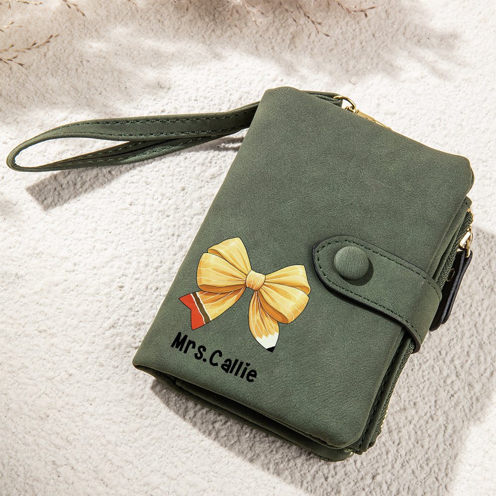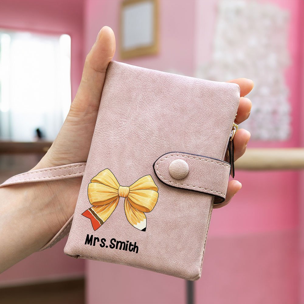 This teacher wallet features a charming coquette pencil bow pattern. It can be customized with the teacher's name, adding a distinctive and Personalized touch and making it a meaningful and cherished gift.