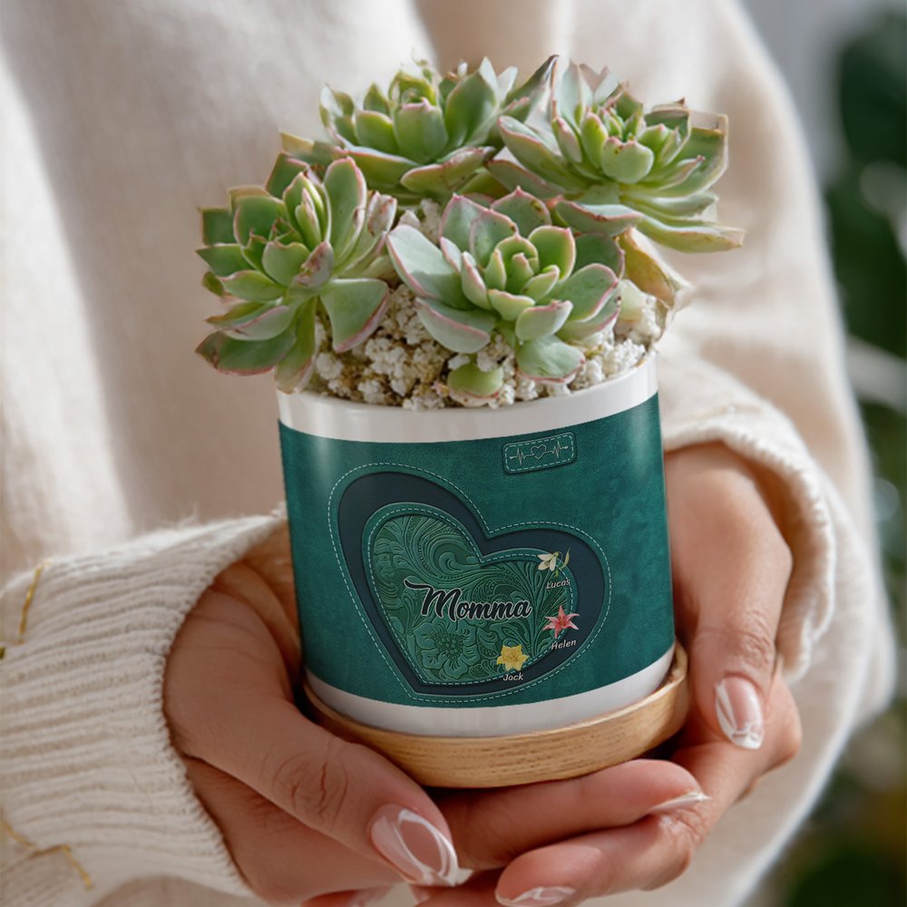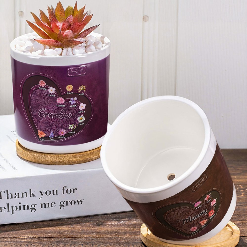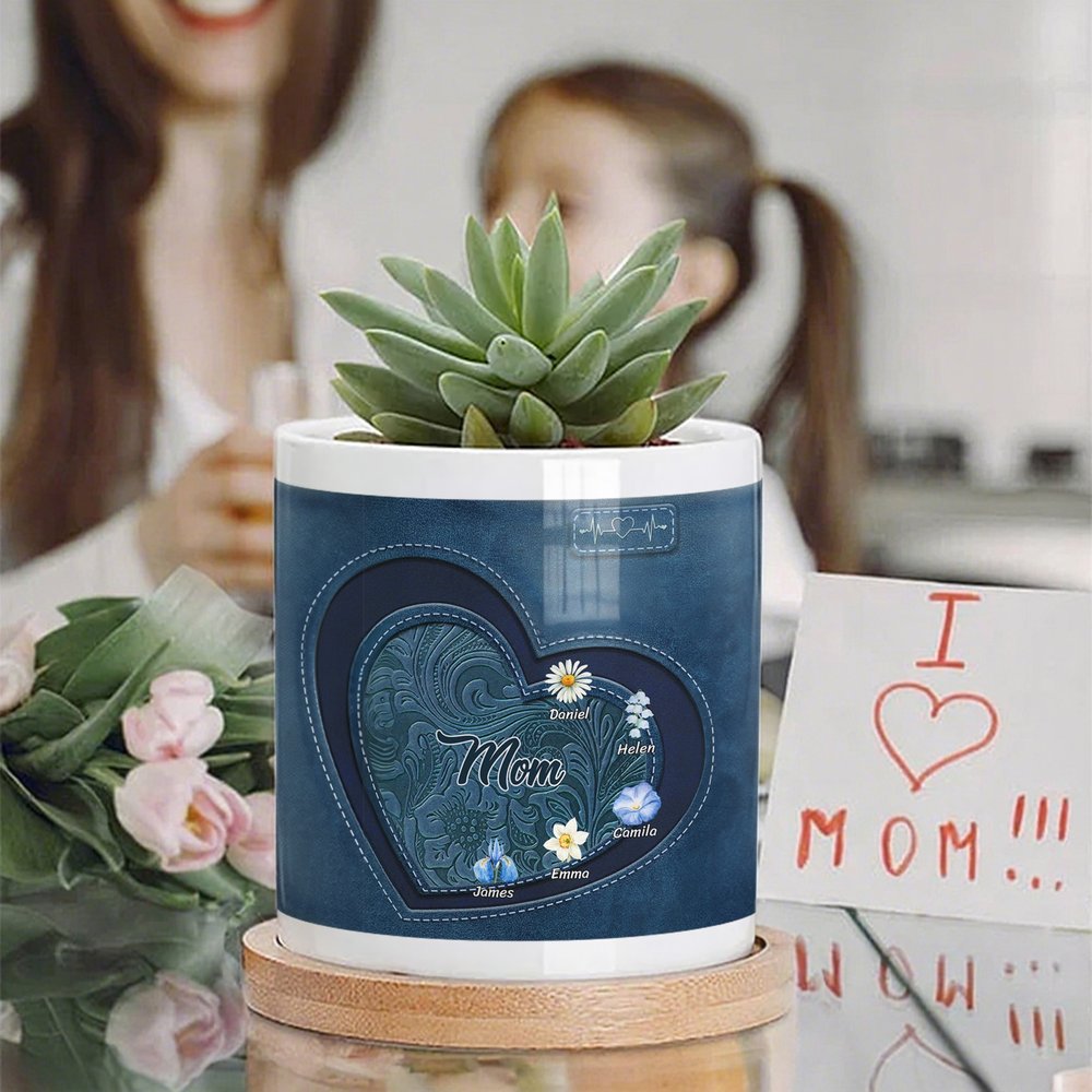 The heart-shaped plant pot is paired with a variety of backgrounds and adorned with beautiful birth flowers. You can freely choose your birth flower and enter the corresponding name to create a unique plant pot full of personal meaning. The overall image is warm and memorable.