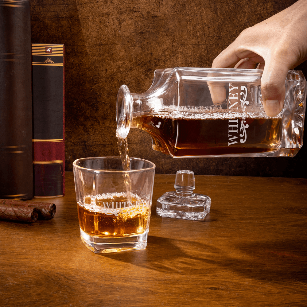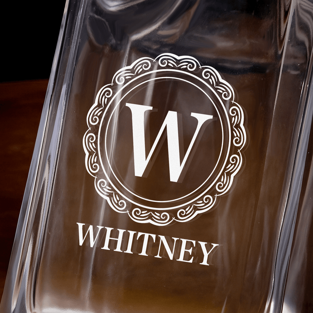 This vintage-style whisky gift set includes a wooden box, a whisky decanter, and a choice of different numbers of whisky glasses. Multiple set combinations are available. The monogram design offers six classic styles, each customizable with a name or initial, turning everyday barware into a refined, personalized keepsake with both display and collectible value.