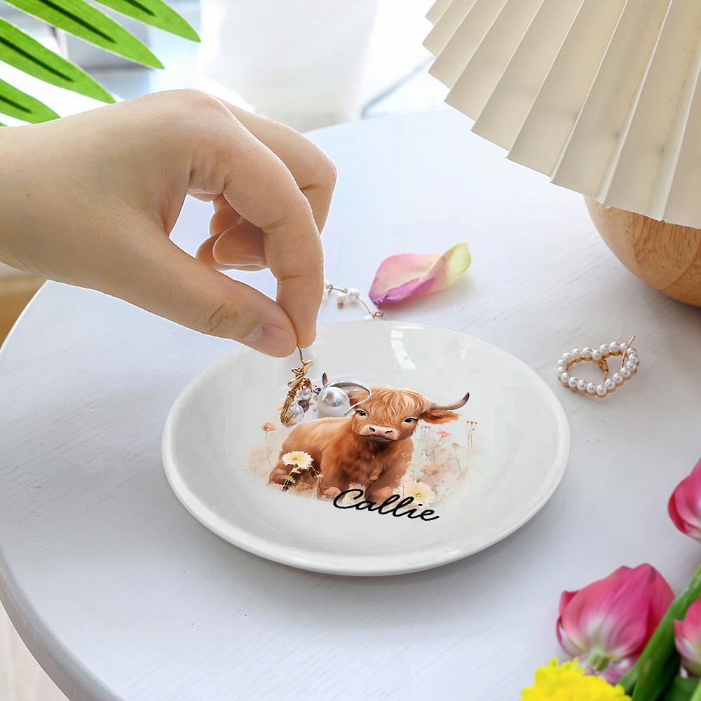 There are 14 different cartoon Highland cow designs on the dish, showing various cute postures, such as cow wearing wreaths, cow standing in buckets, etc. These designs add fun and visual appeal. You can also print your or the recipient's name on the dish to give it a unique and exclusive meaning.