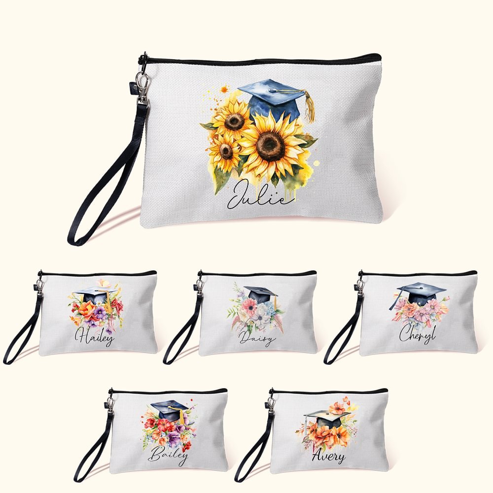 This makeup bag is an actual work of art featuring a stunning watercolor-inspired design that captures the joy and excitement of graduation. The centerpiece of the design is a beautiful bouquet, symbolizing the radiant energy and optimism that comes with this momentous achievement. Nestled within the vibrant floral arrangement is a graduation cap, a testament to the hard work and dedication that has led to this milestone.