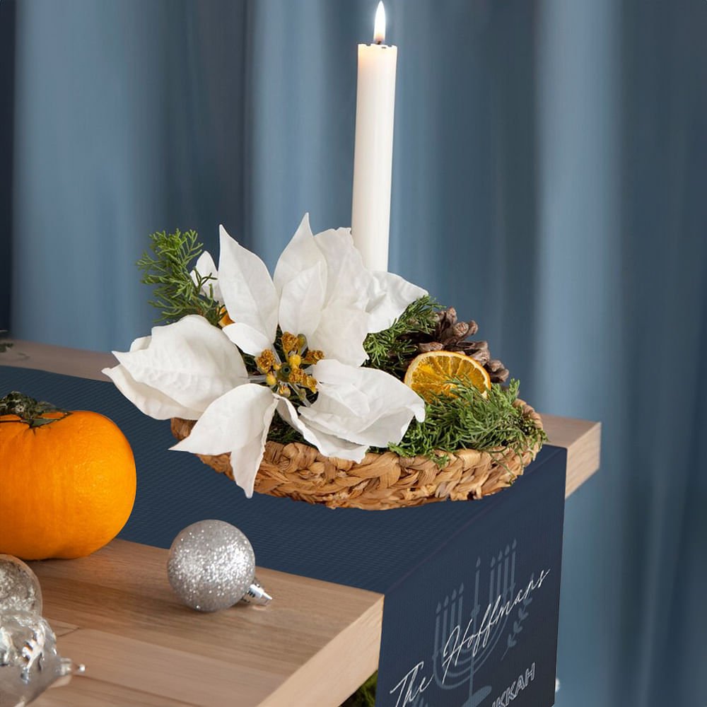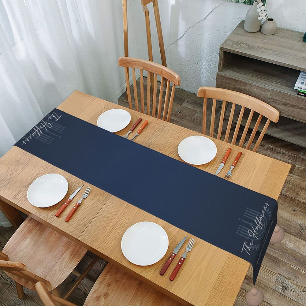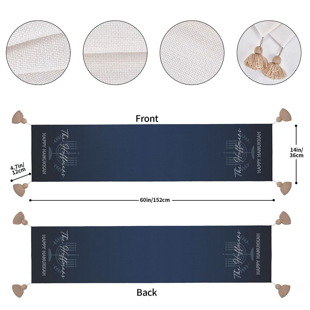 This charming table runner is designed with a Hanukkah theme. The unique nine-branch menorah pattern with branches symbolizes light, hope, and rebirth. It symbolizes lighting up the lights during the holiday season, dispelling darkness, and transmitting positive energy. You can also customize the text on the blanket to make it more unique.