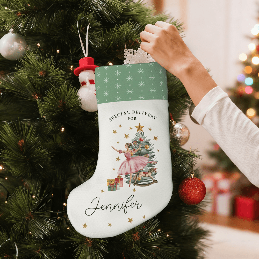 Inspired by festive charm, this Christmas stocking features a delightful array of patterns, including Santa Claus, Nutcracker, Ballet Dancer, Reindeer, Forest Animals, and Snowman. Each stocking can be personalized with a name, instantly adding a magical touch to your holiday decor and making it a unique piece for your home.