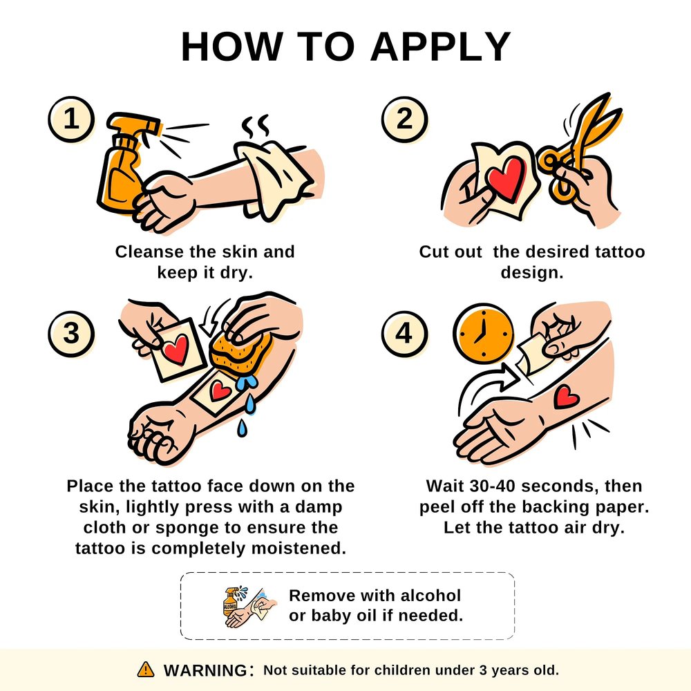 | Care: | • For best results, make sure your skin is dry and free of oil, lotion, and makeup. • Choose a smooth, hair-free area to avoid wrinkling. • Avoid getting the temporary tattoo wet for at least a few hours after application. • When removing the temporary tattoo, gently rub it with wet wipes, eye makeup remover, baby oil, and rubbing alcohol. |