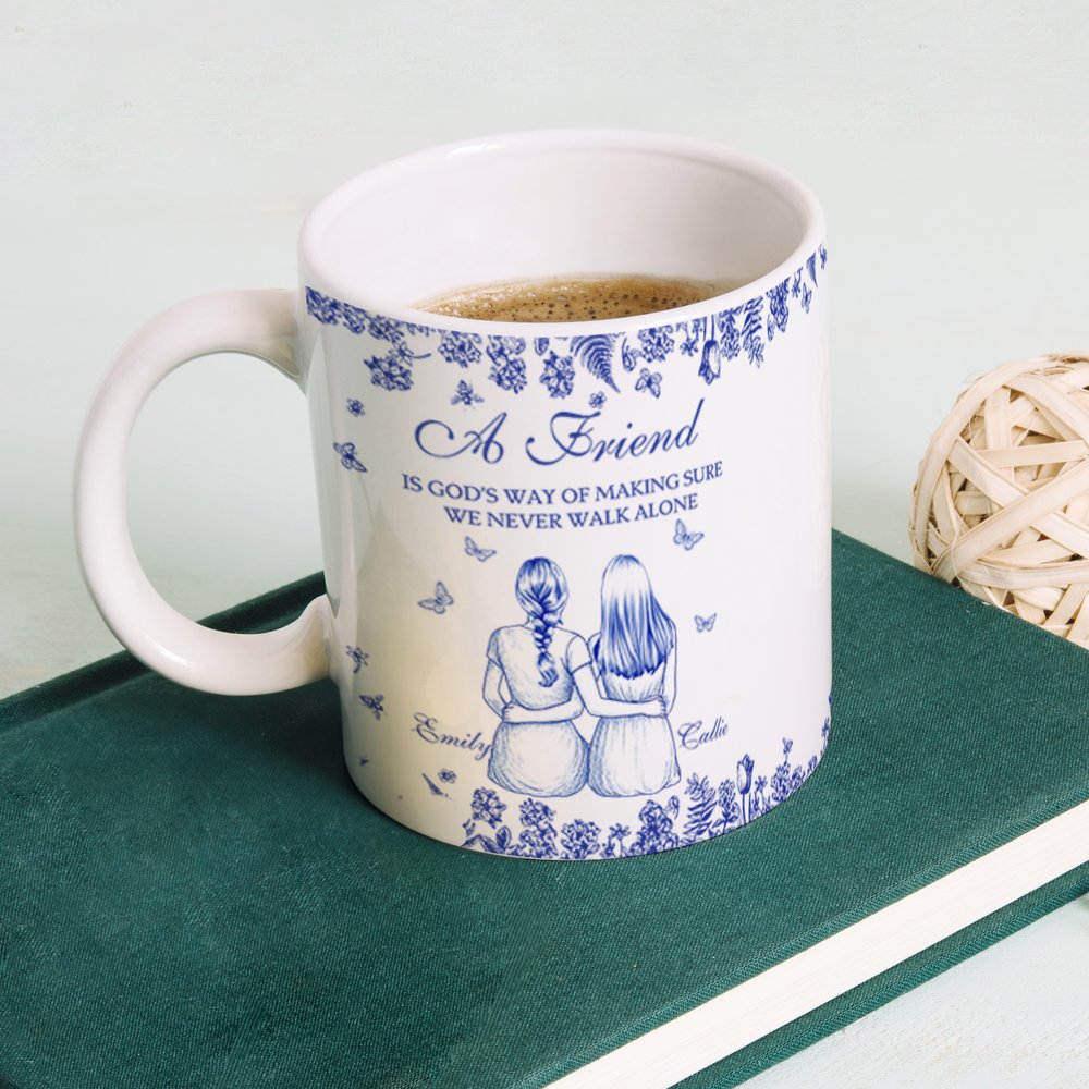 This mug features a charming vintage design that can be customized with 2-5 cartoon characters, each accompanied by their name, weaving your unique bond into the mug. Delicate floral and butterfly elements decorate the illustration, complemented by the uplifting title, "We Never Walk Alone." Every detail is etched with the warmth of friendship, transforming this mug from a simple vessel into a cherished keepsake of your shared memories.