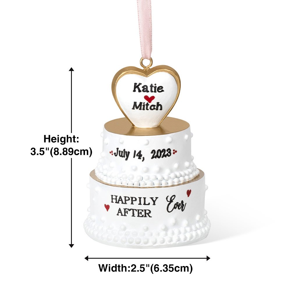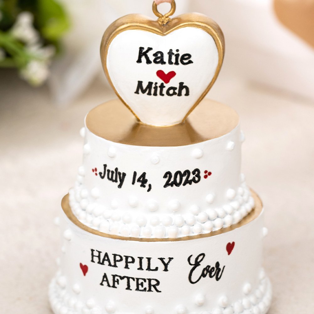This polyresin ornament is shaped like a small tiered wedding cake with their names and wedding dates painted on in ink. The laser engraving ensures a precise and elegant finish, adding a touch of uniqueness to the ornament. It makes for a thoughtful and meaningful gift for newlyweds or couples celebrating anniversaries.