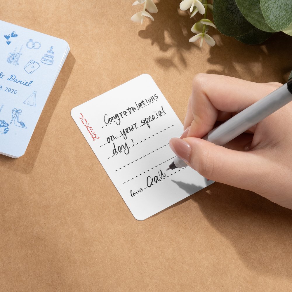 These playing cards offer an innovative and interactive alternative to traditional paper guestbooks. During the ceremony or reception, place the playing cards in a designated area and allow guests to write their well-wishes directly on the cards. This engaging format not only inspires guest engagement but also adds a warm and emotional touch to the guestbook experience.