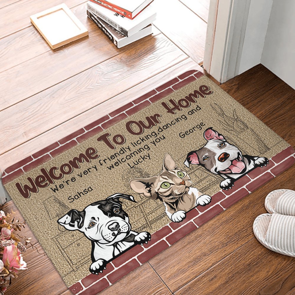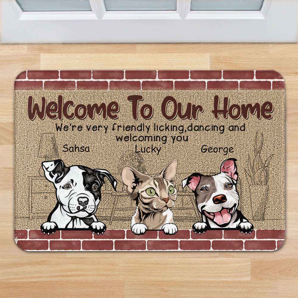 The phrase "Welcome To Our Home We're Friendly Licking Dancing And Welcoming You" shows the humor and fun of pets and their owners. Print this unique phrase on the mat with your pet's exclusive name to treasure the cuteness of your pet and the owner's love for your pet forever.