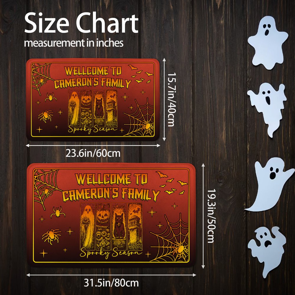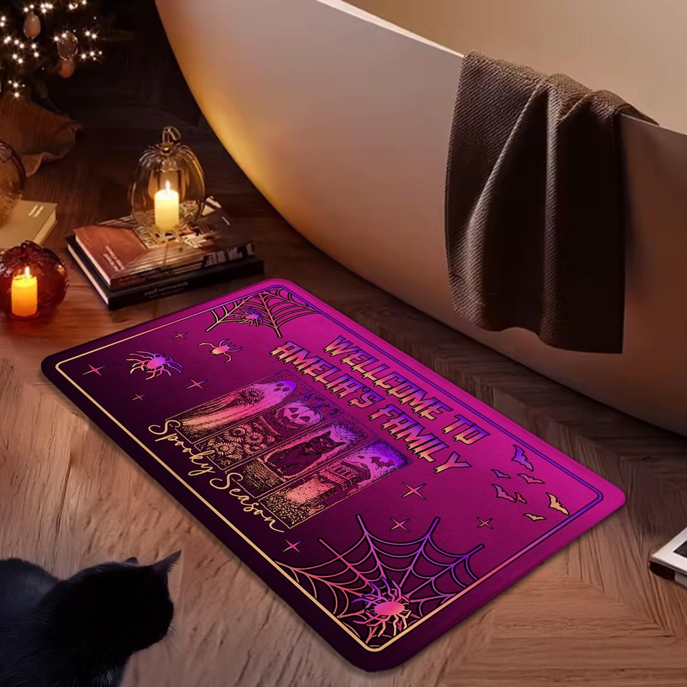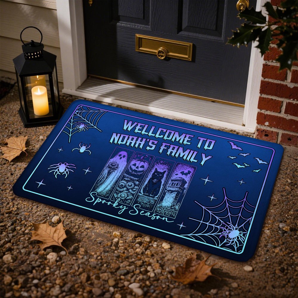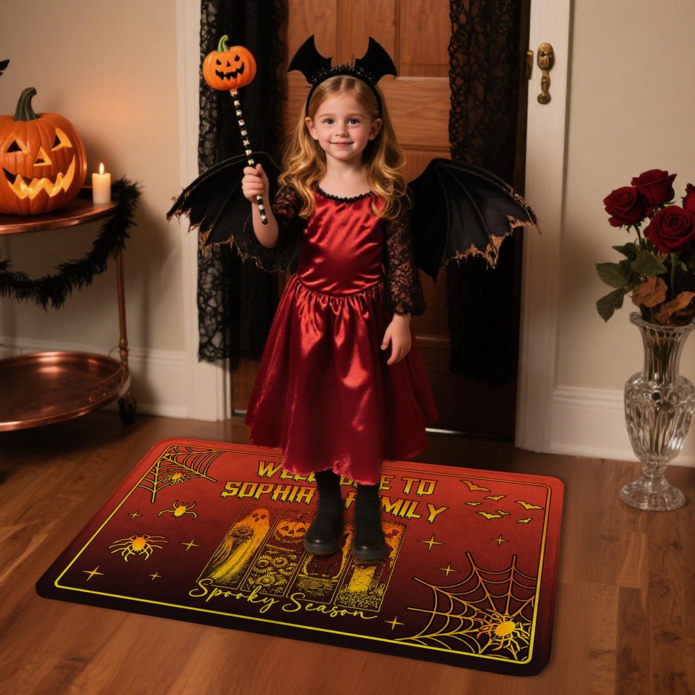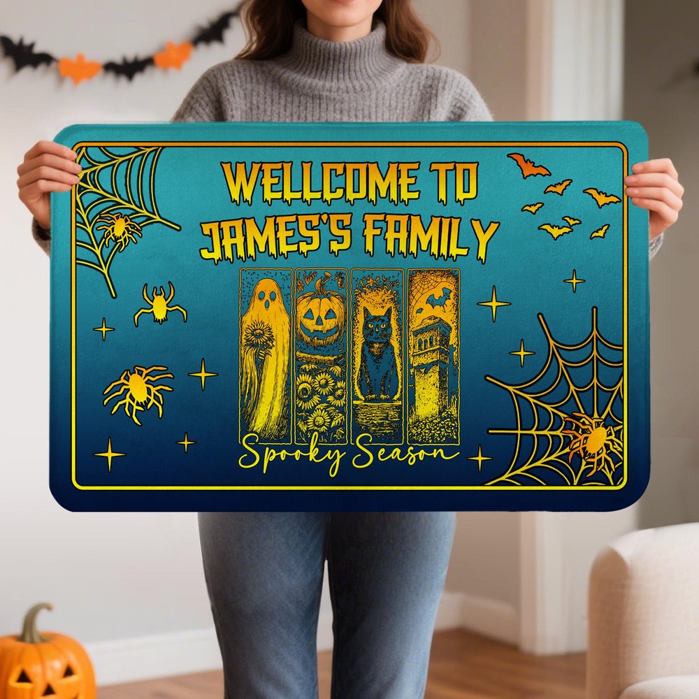 The doormat features a rugged, retro hand-painted style, romantically blending classic Halloween elements like ghosts, pumpkins, and black cats with idyllic flowers for a striking visual impact. Customizable text "Welcome to ...'s Family" is also available, preserving the Halloween spirit while breaking the supernatural stereotype and adding a touch of warmth.