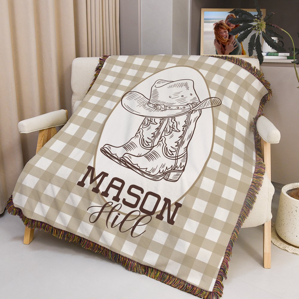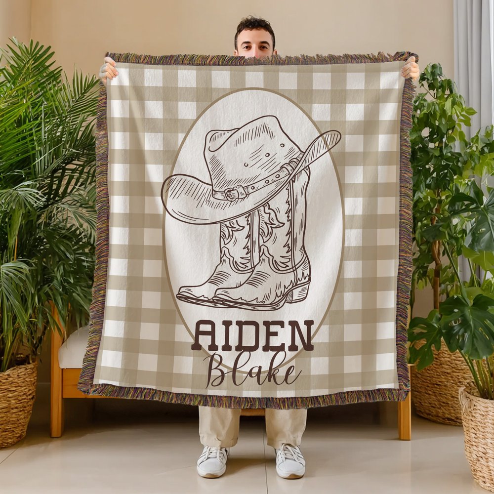 This blanket is designed to be warm and has a soft colour tone. It is designed for infants and children. The blanket pattern is decorated with cowboy-style boots and hat patterns, exuding a childlike innocence and freshness. Its uniqueness lies in the ability to add your first and last name, making each blanket unique.