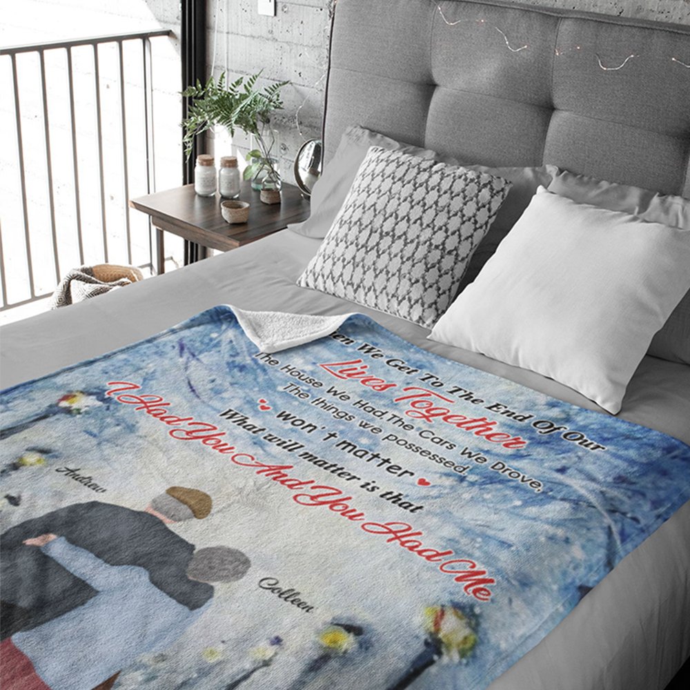The "When We Get To The End Of Our Lives Together" quote celebrates the unbreakable love you share with your lover. Make this romantic love last forever by printing romantic quotes on the blanket and customizing it with your names.