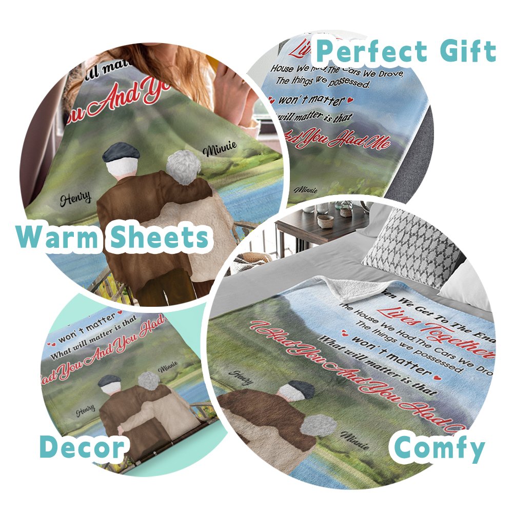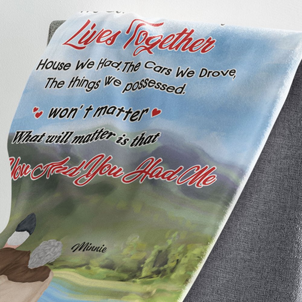 The blanket is designed with a couple as the design element, in the centre is a pair of elderly people snuggling with each other taking a walk, and in the background is a beautiful natural scenery of mountains and rivers, the picture is harmonious and beautiful. With the slogan "When We Get To The End Of Our Lives Together", is even more romantic and touching. You can add your names to it to make it an exclusive souvenir.