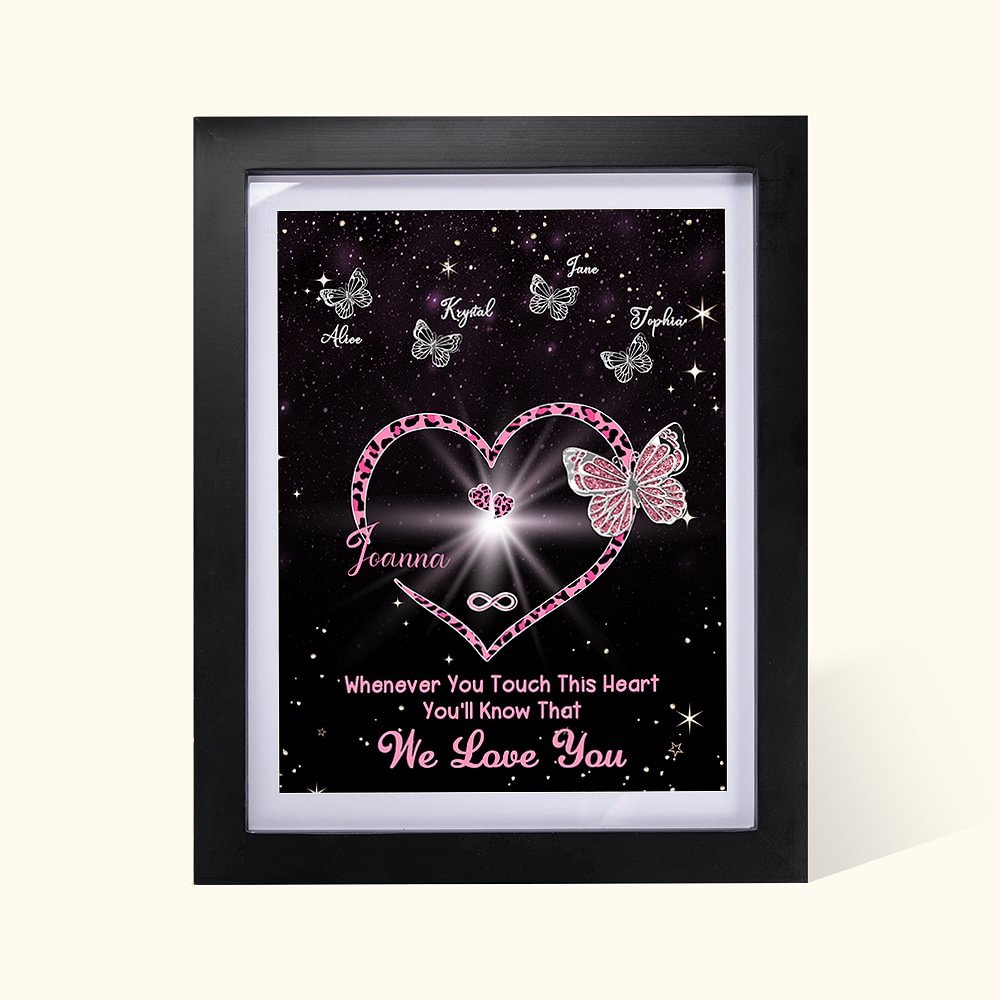 The heart butterfly photo frame features a mom or a grandma butterfly's huge heart design along with 1-9 small butterflies that can be customized with names. It is an ideal choice for your mom or grandma on Christmas or Mother's Day.