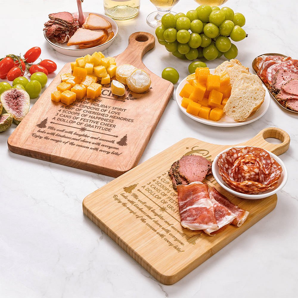 This exquisitely engraved cutting board with a warm, customizable Christmas recipe is a great way to celebrate the holiday season. Customize your family's Christmas recipes to enjoy the warmth and sense of family in this cold season. The cutting board retains the natural colour and texture of wood, walnut, bamboo, mahogany, and cherry wood—four different materials and colours to enrich your choice. "Mix well with laughter and warmth, bake with kindness..." is fixed text on the cutting board.