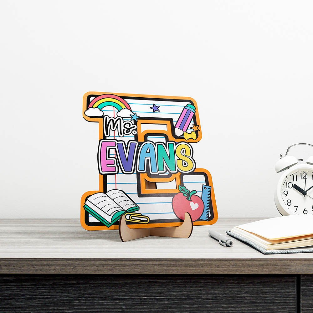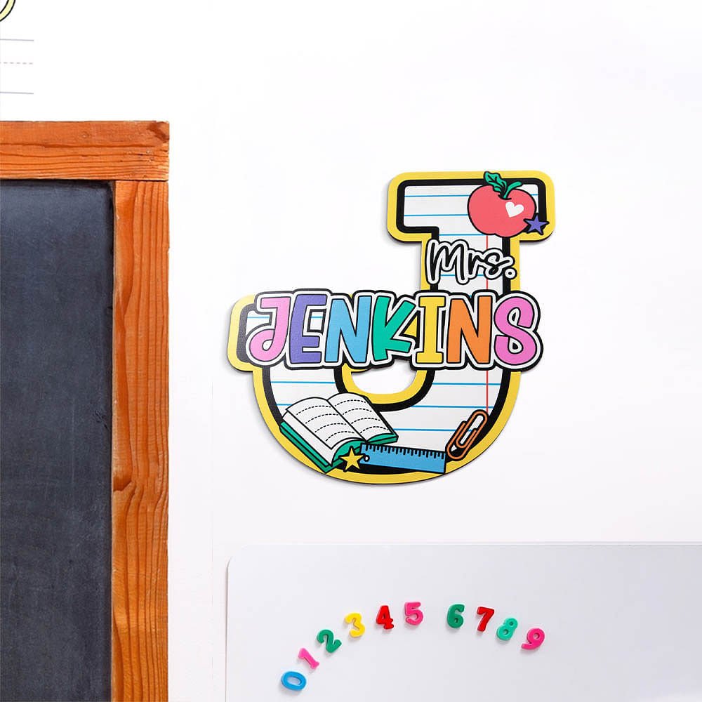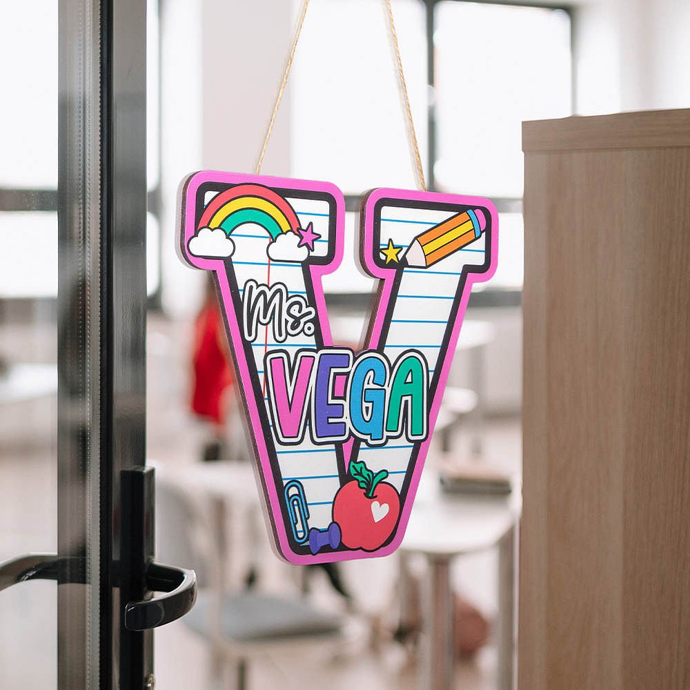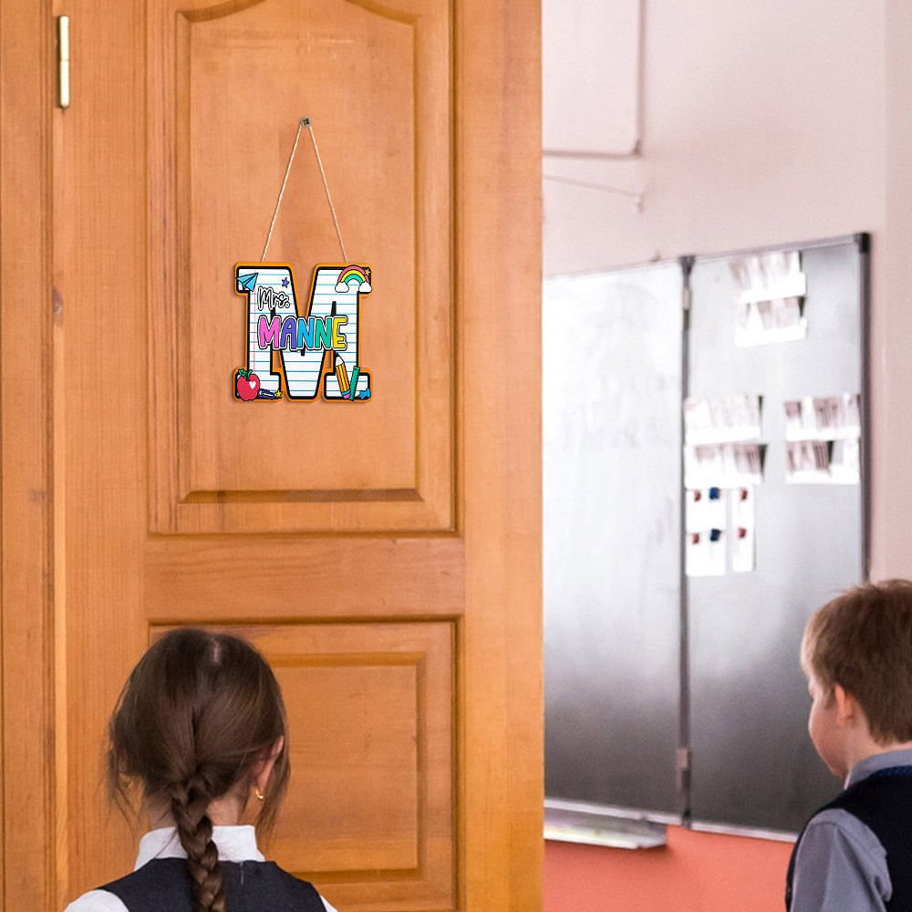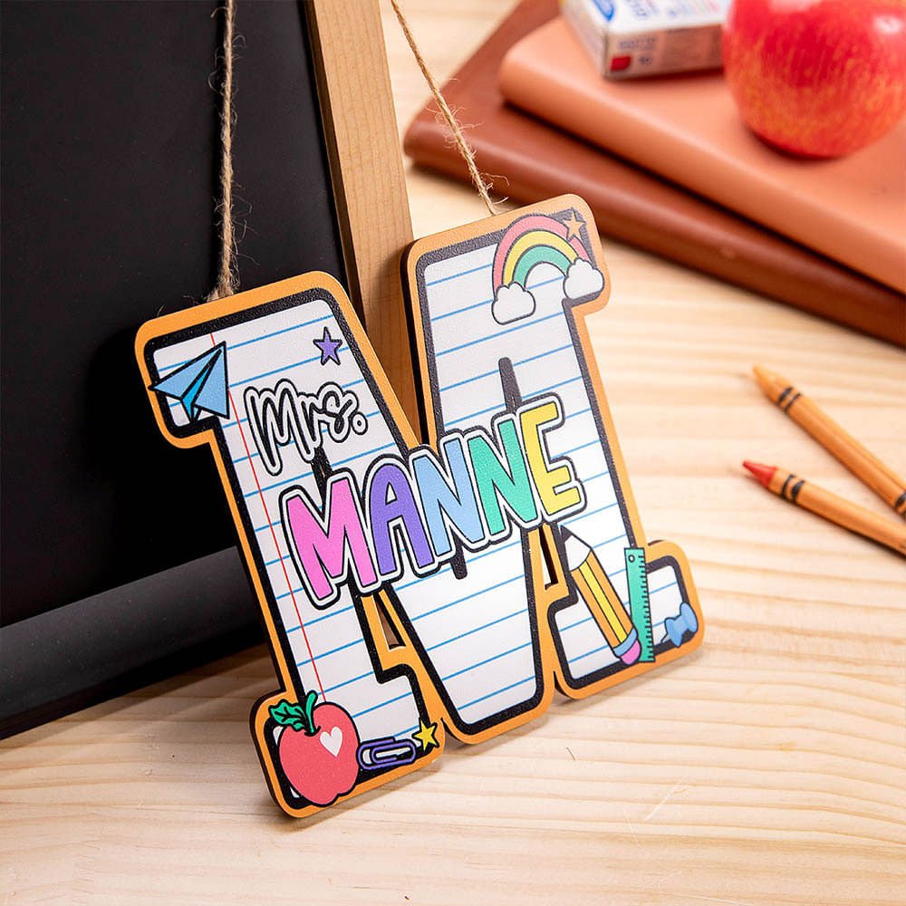 Elevate any classroom with this Personalized wooden door sign featuring the teacher's name initial and charming apple, notebook, and pencil elements. It's a perfect addition to creating a welcoming environment for students and educators.