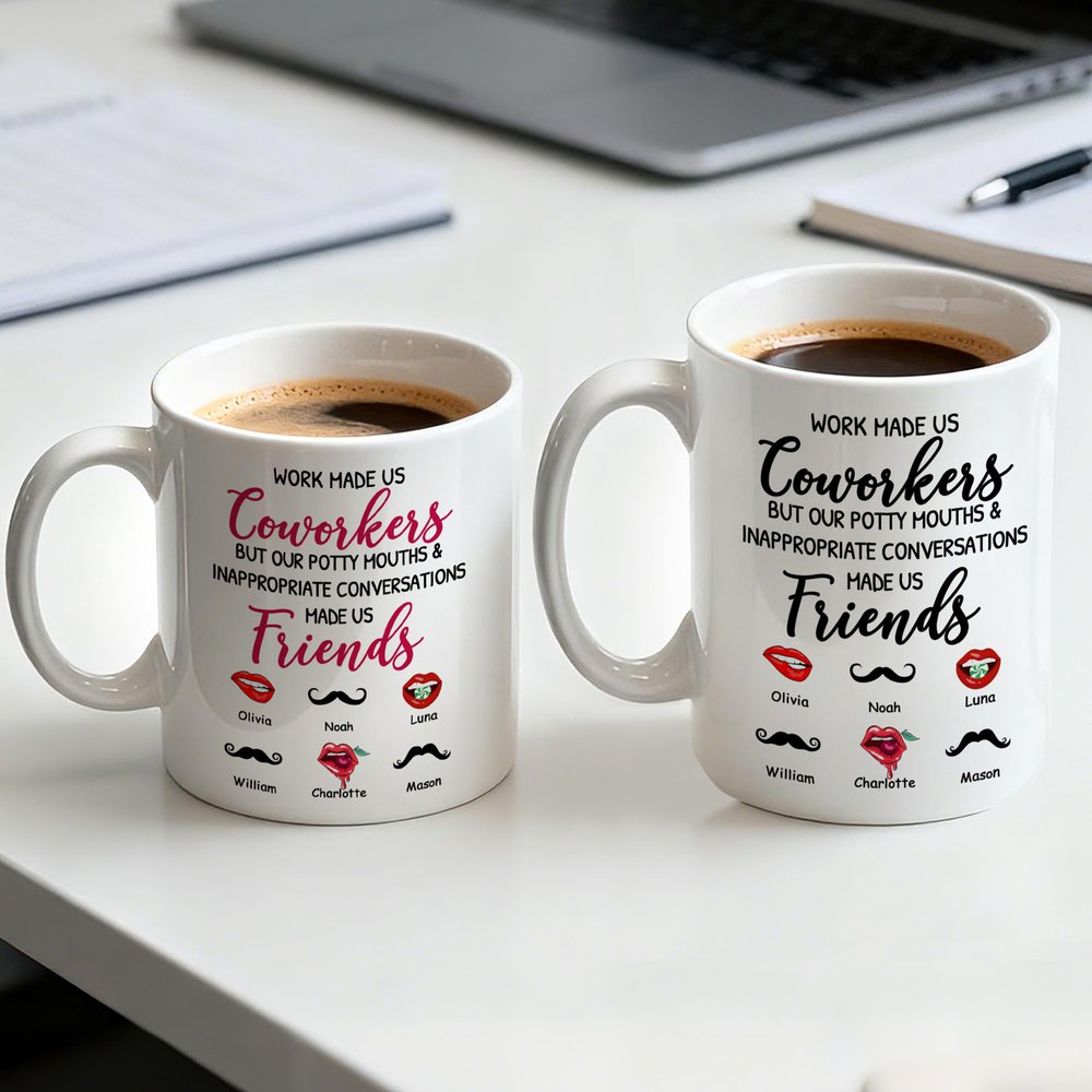 This mug playfully captures the journey of colleagues becoming friends with the humorous phrase, "WORK MADE US Coworkers BUT OUR POTTY MOUTHS & INAPPROPRIATE CONVERSATIONS MADE US Friends." It features personalized lip and mustache designs for different genders, adding an enjoyable touch. You can also customize it with the names of 2-8 people, uniquely uniting colleagues. This makes each mug a special embodiment of team spirit—both practical and meaningful.