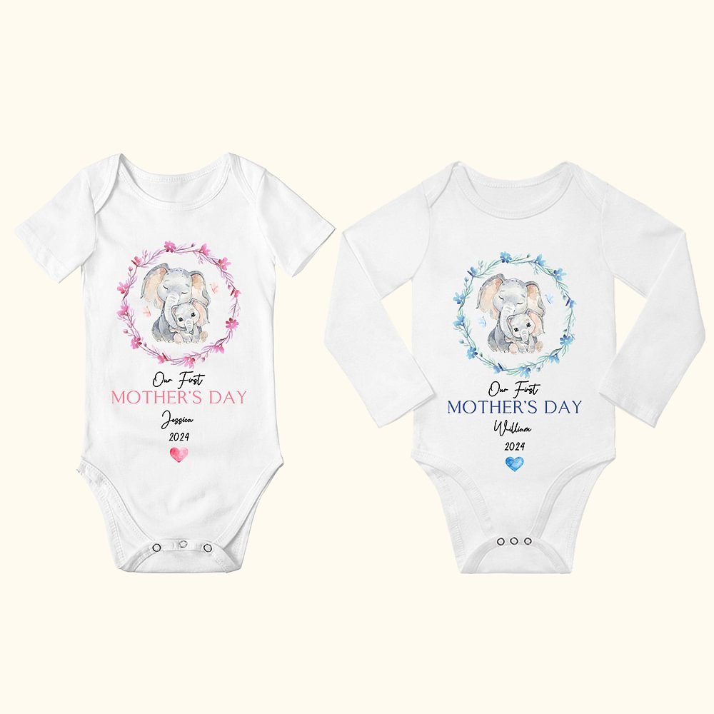 The Garland Elephant design on T-shirts and onesies is so cute and creates a warm and playful look. The celebratory text of "Our First Mother's Day" makes the holiday atmosphere more intense and warm. With the option to add your and your child's names to the front of the garment, this adorable set is the perfect gift for a new mom and her precious child's first Mother's Day.