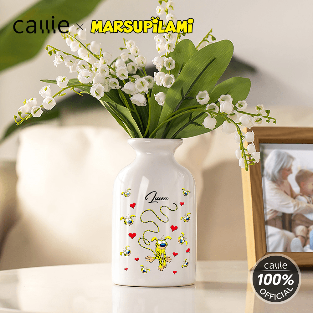 You can choose the cute cartoon image pattern of the long-tailed leopard, which was created by Belgian cartoonist André Franquin in 1952. Marsupilami is a jungle-dwelling creature with yellow fur, black spots, and a super flexible, long tail. This vase also supports name customization, perfectly blending individuality and practicality, transforming an ordinary vase into a personalized item that showcases your unique taste.