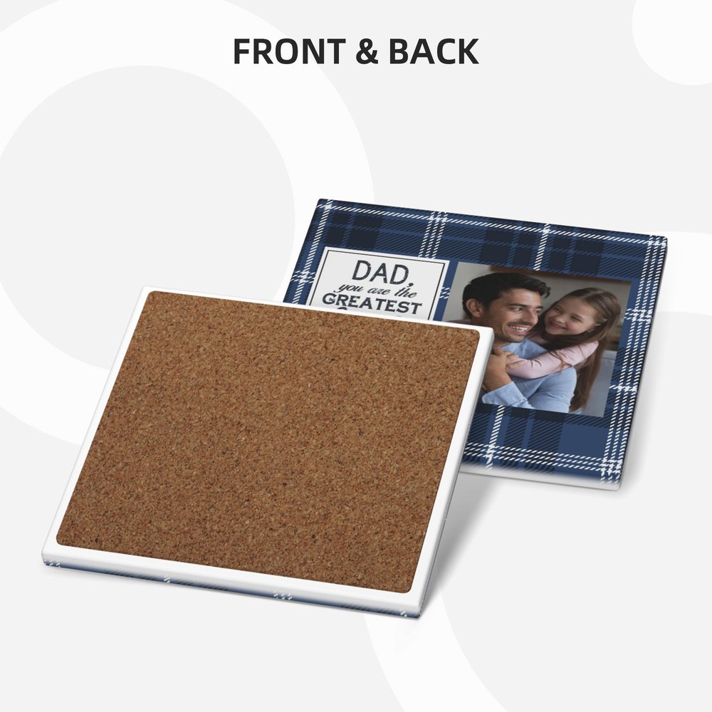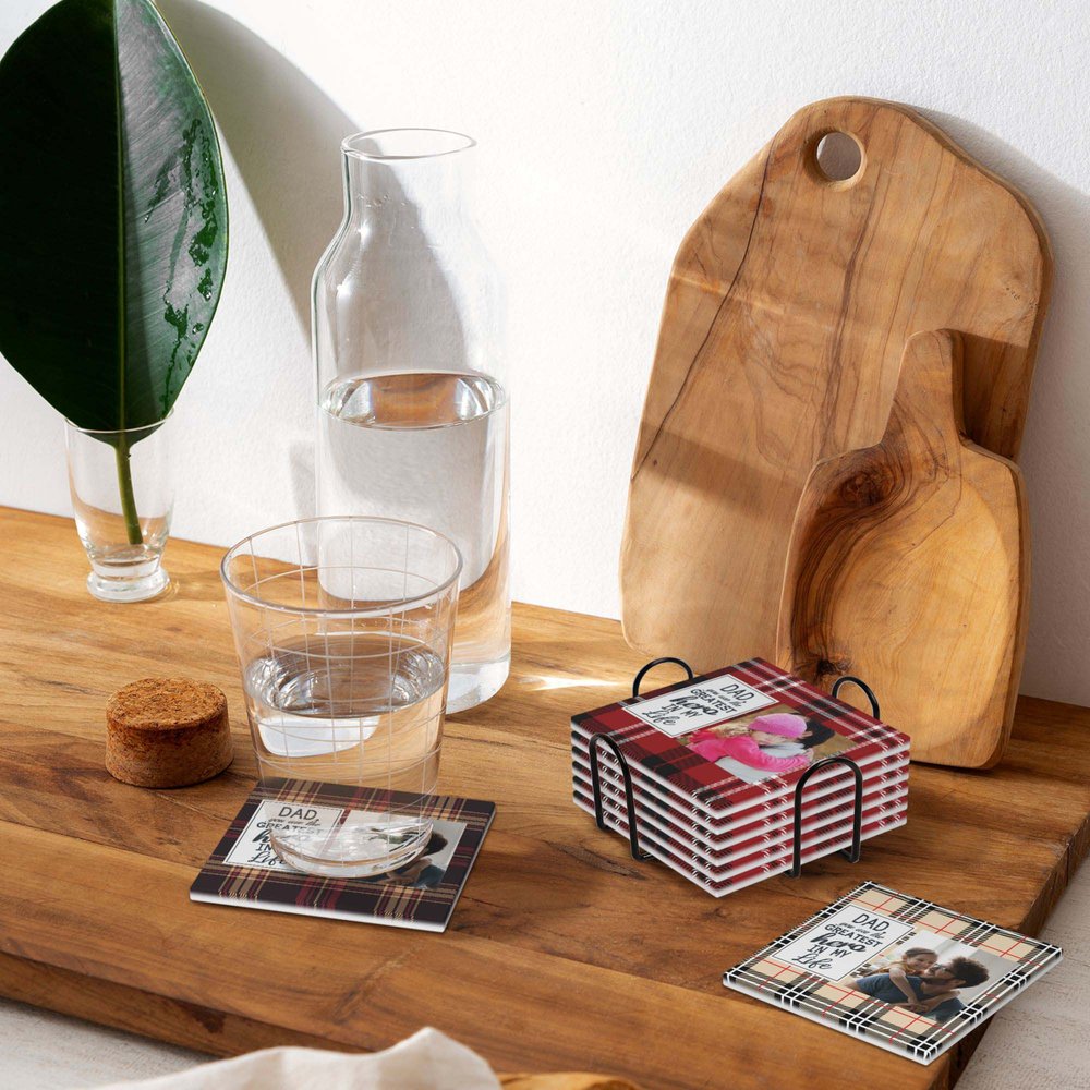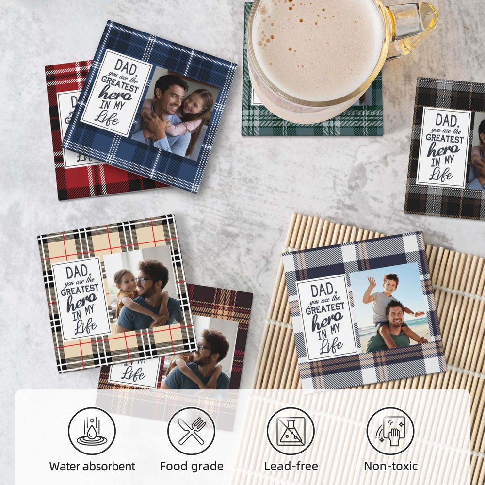 These coasters feature buffalo plaid design in 7 colour options, adding vintage and classic charm. The heartfelt message "Dad, you are the greatest hero in my life" celebrates the special bond between you and your father. You can also personalize them by uploading a photo to preserve cherished memories.